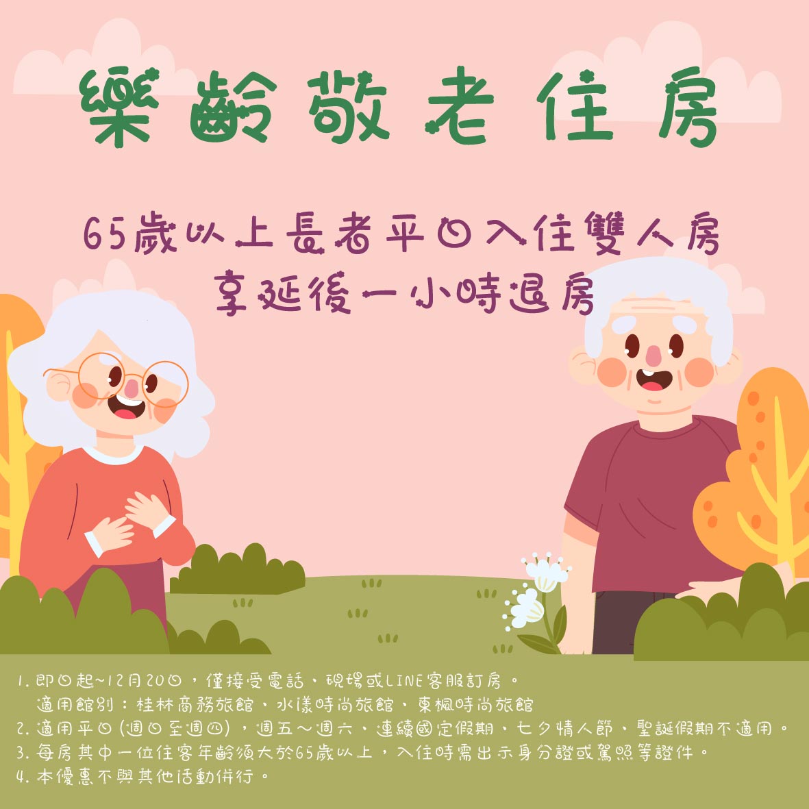 優惠內容:65歲以上長者於平日入住雙人房型,享延後一小時退房優惠。
