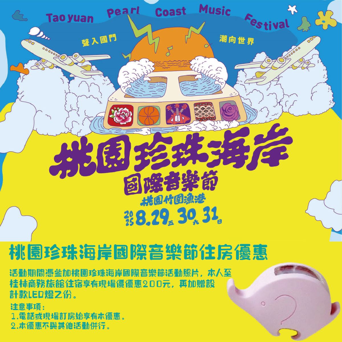 優惠內容:活動期間憑參加桃園珍珠海岸國際音樂節活動照片,本人來館住宿享有現場價優惠200元,再加贈「設計款大象造型防水LED燈」乙份。