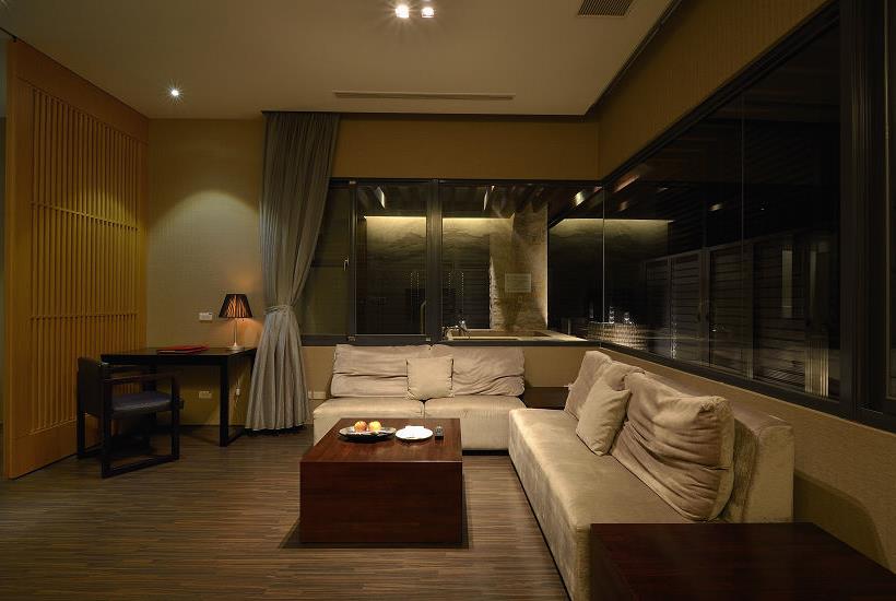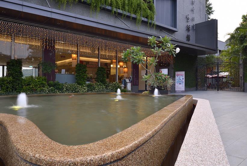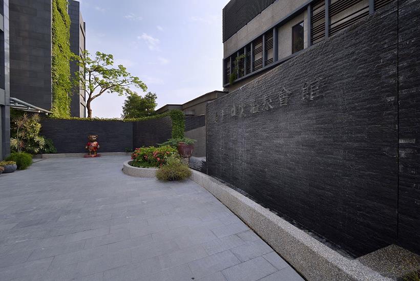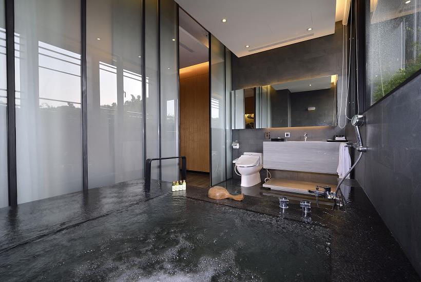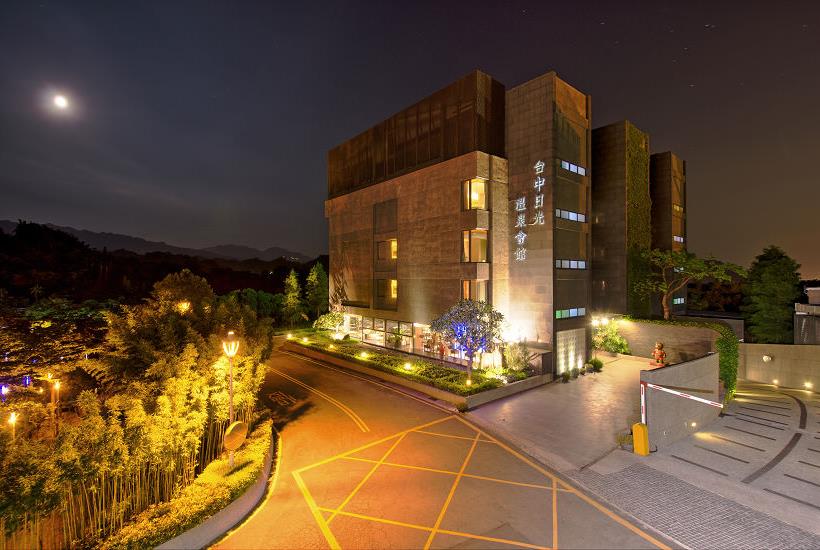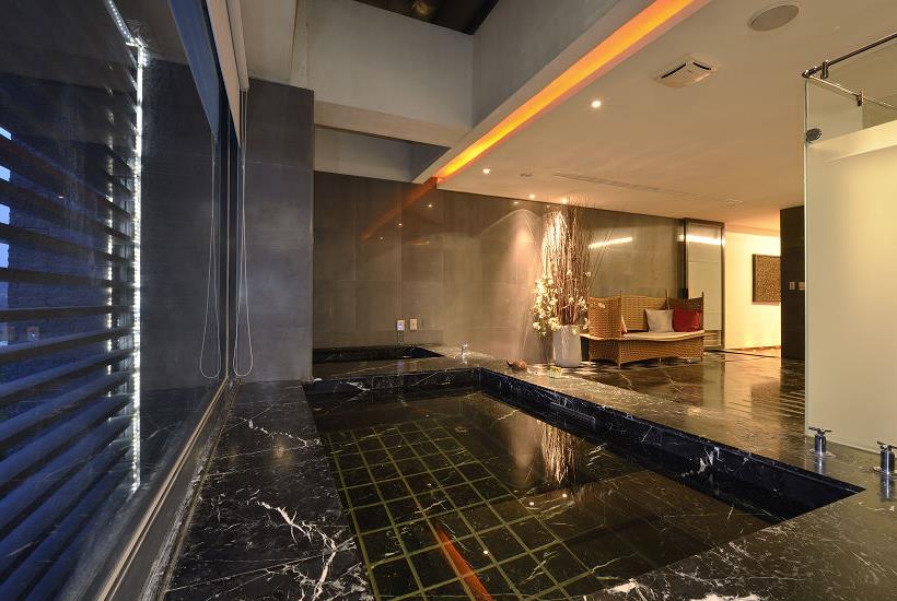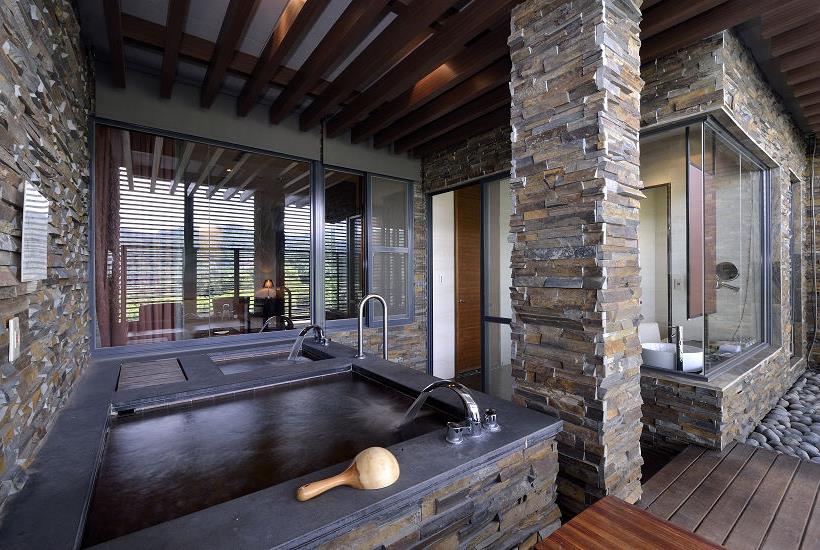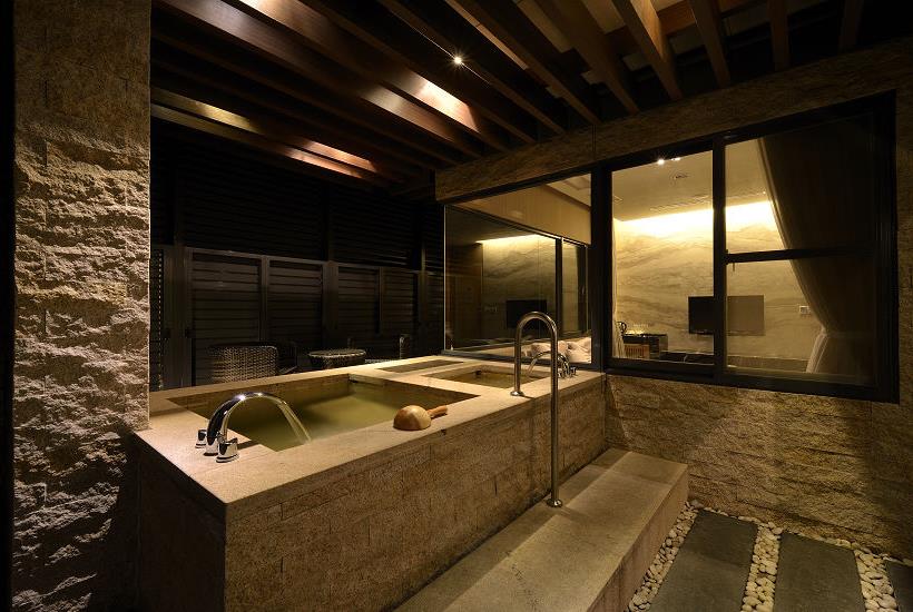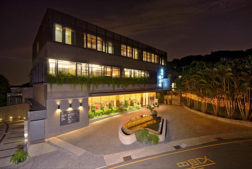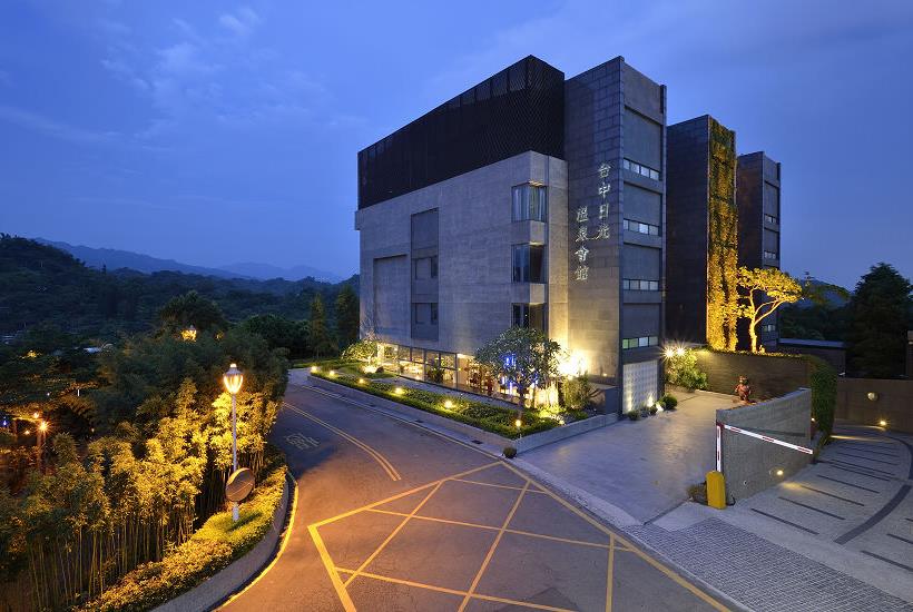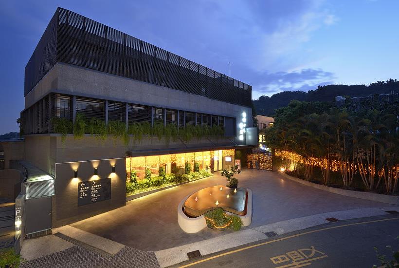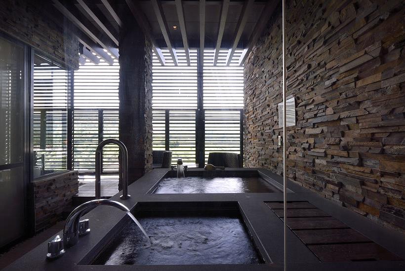 日光溫泉外觀內斂典雅的黑觀音石,烘托建築物獨特沉靜氣度,簡潔線條建構舒適空間,