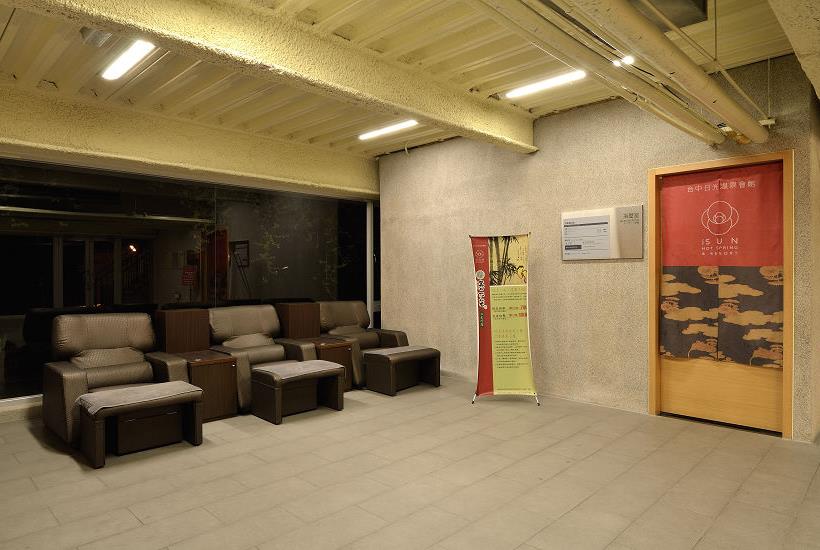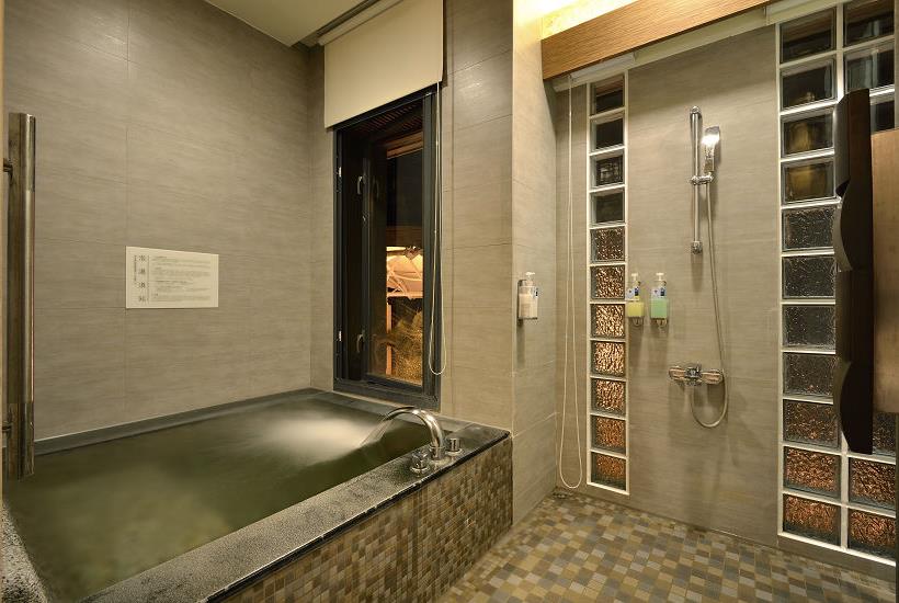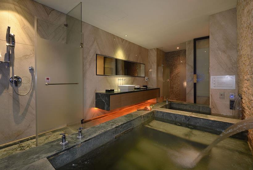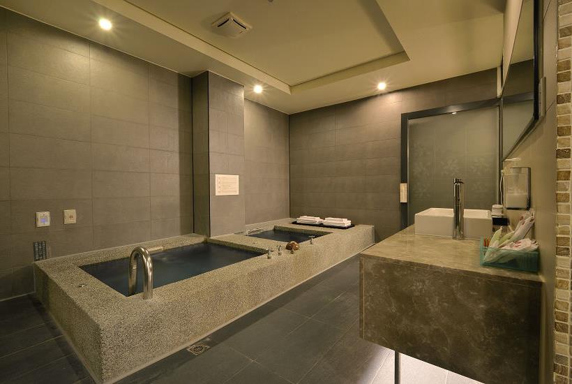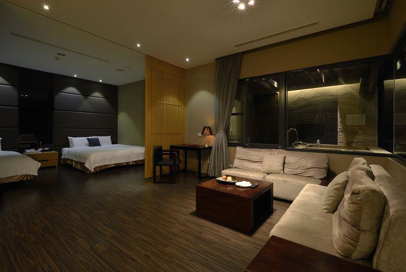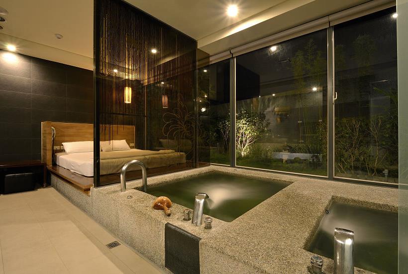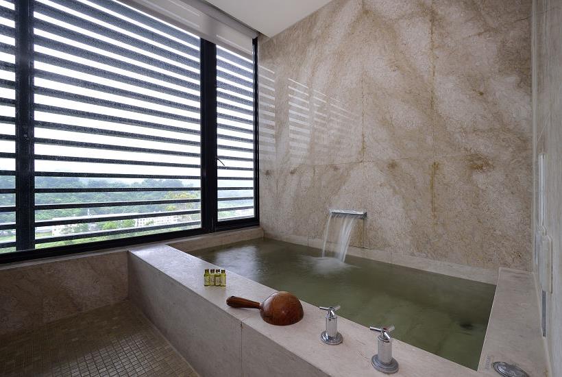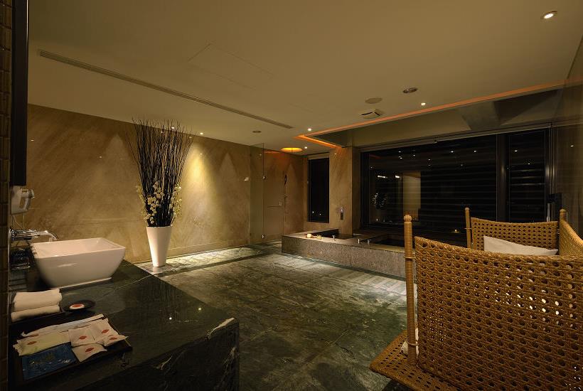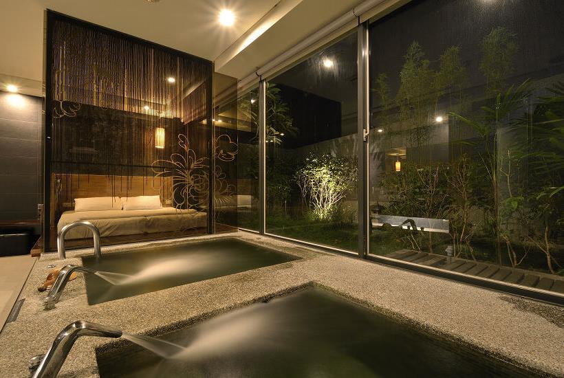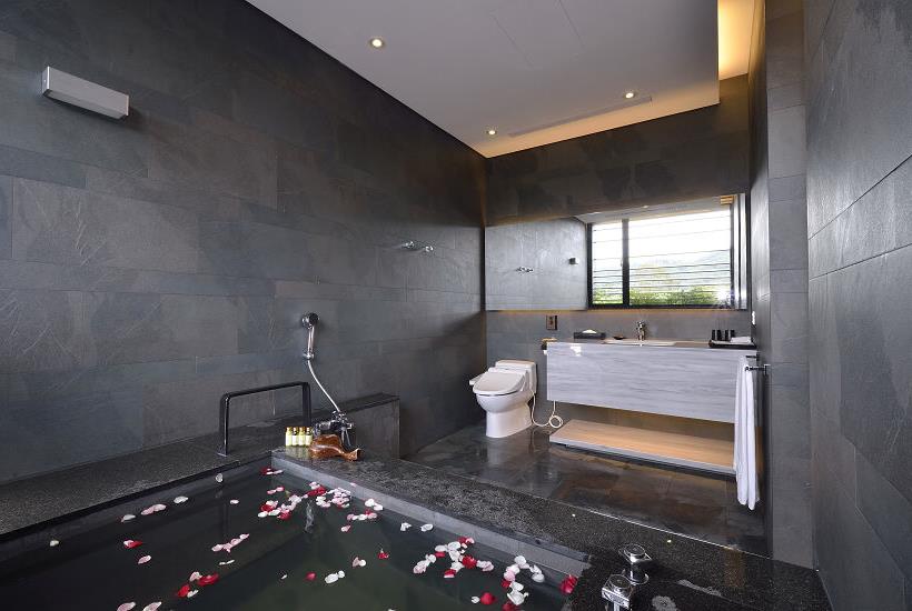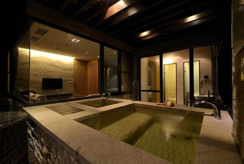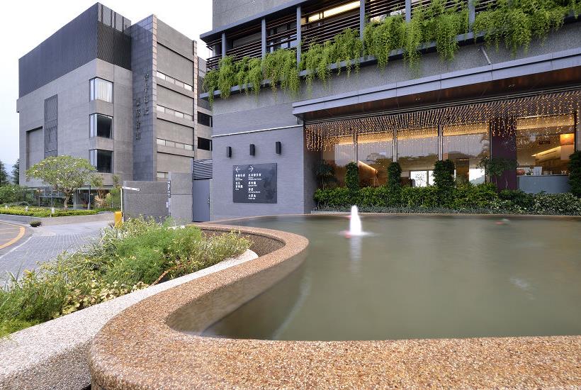 日光溫泉外觀內斂典雅的黑觀音石,烘托建築物獨特沉靜氣度,簡潔線條建構舒適空間,