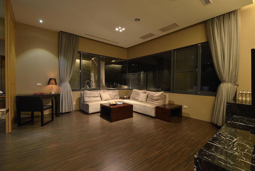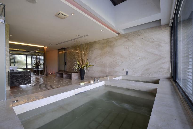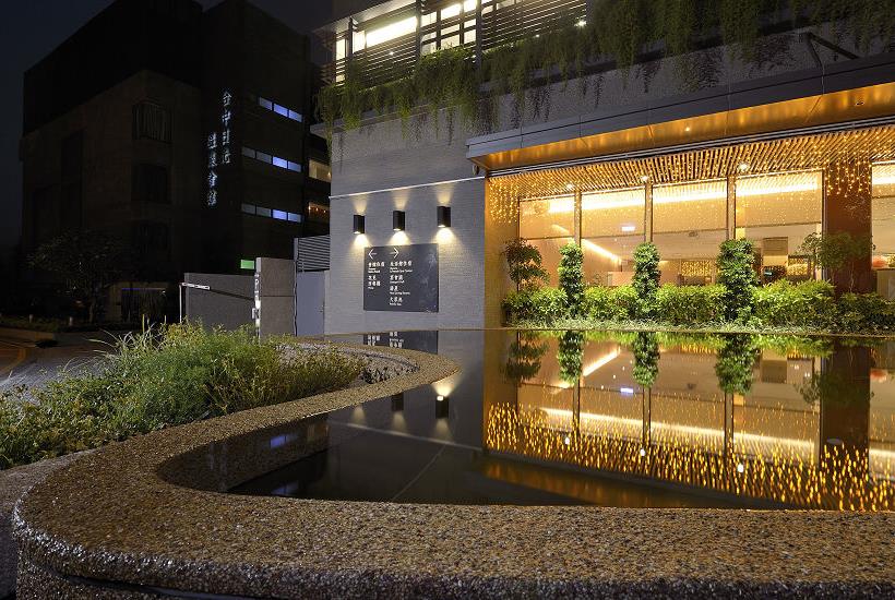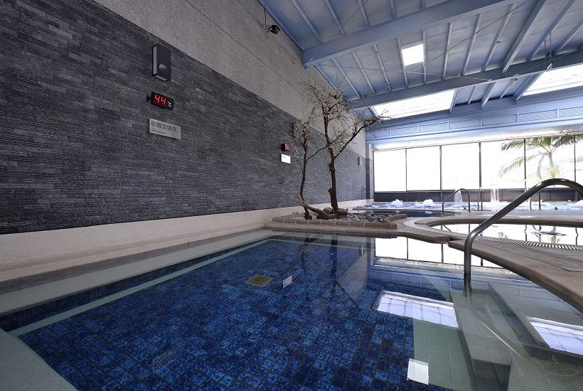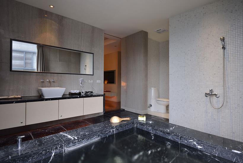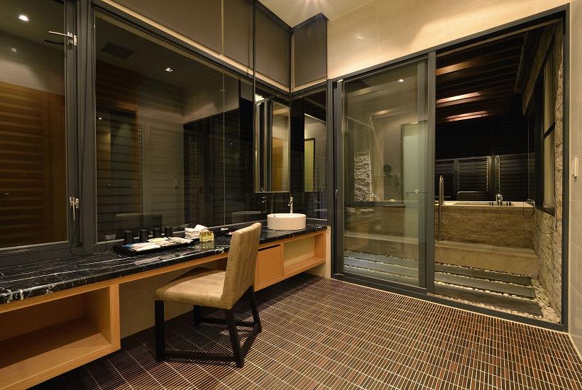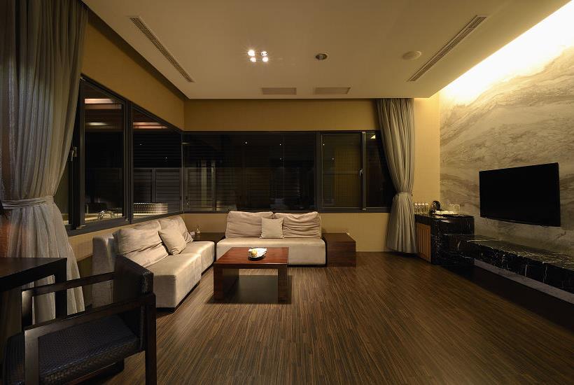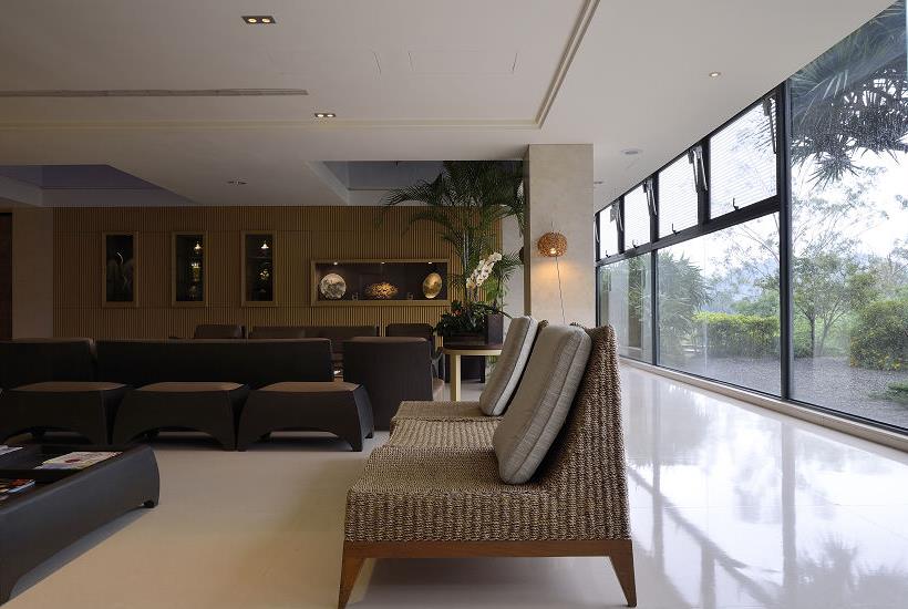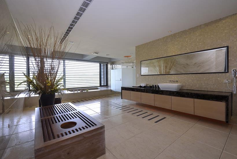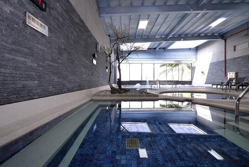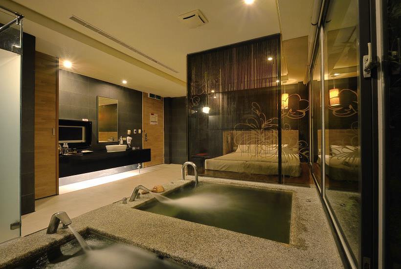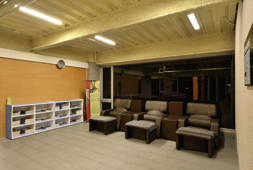 日光溫泉外觀內斂典雅的黑觀音石,烘托建築物獨特沉靜氣度,簡潔線條建構舒適空間,
