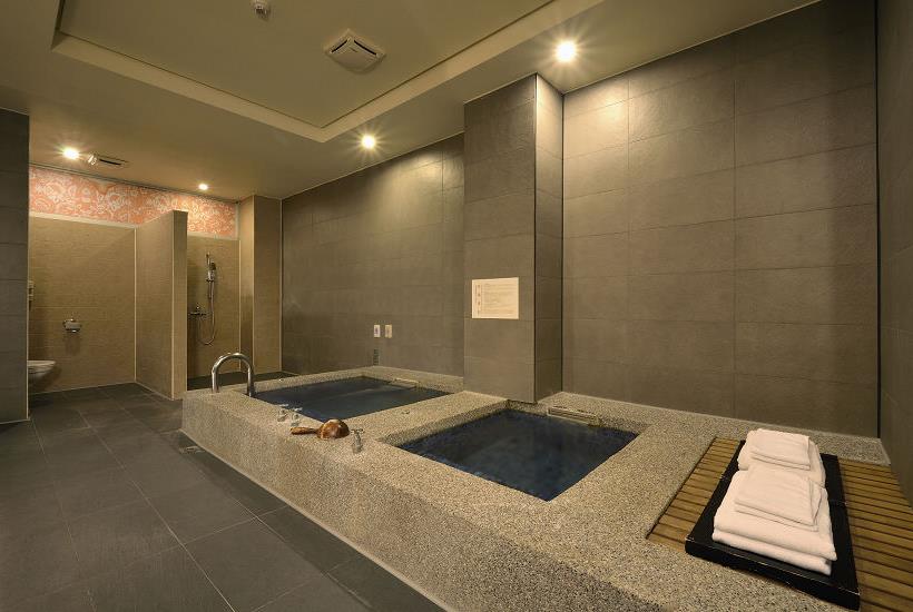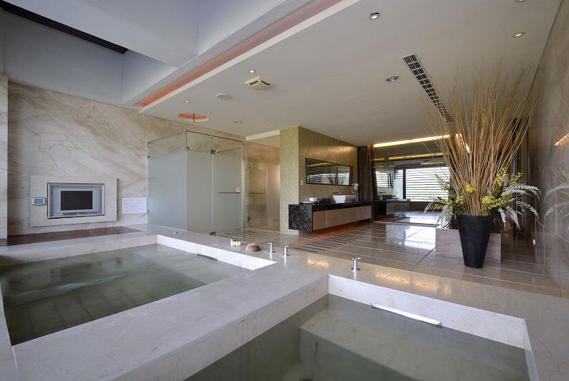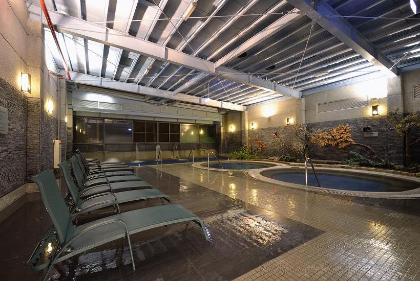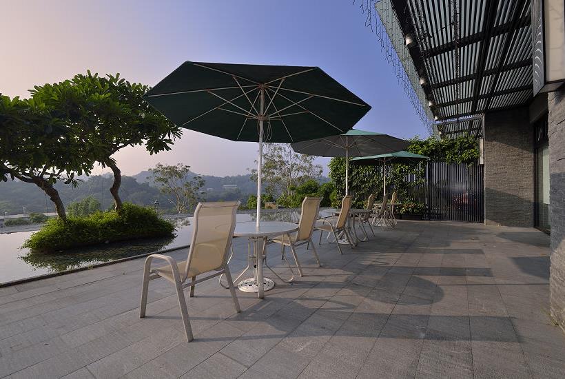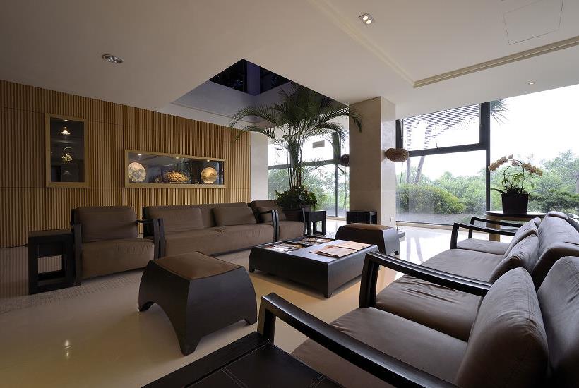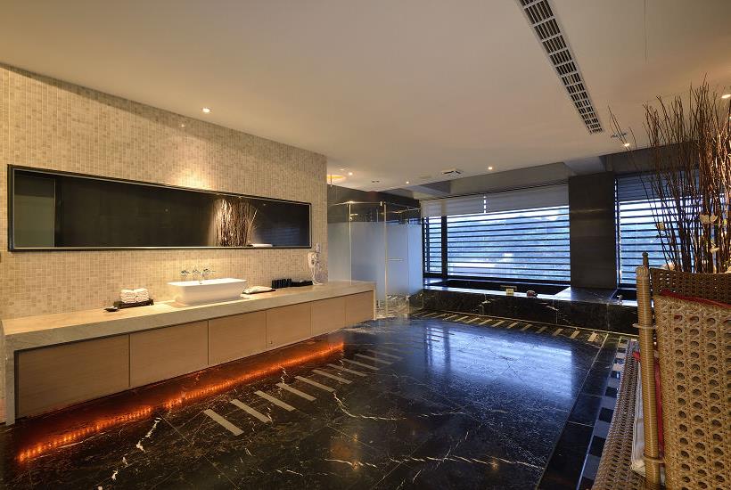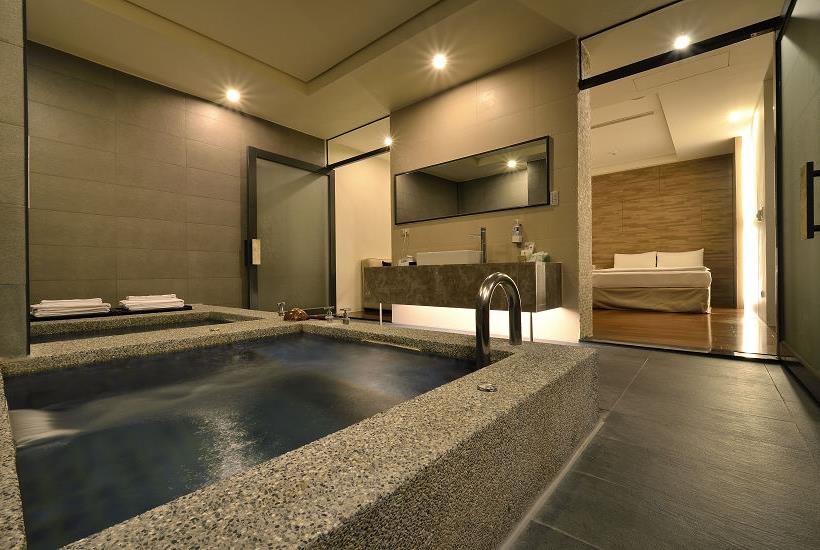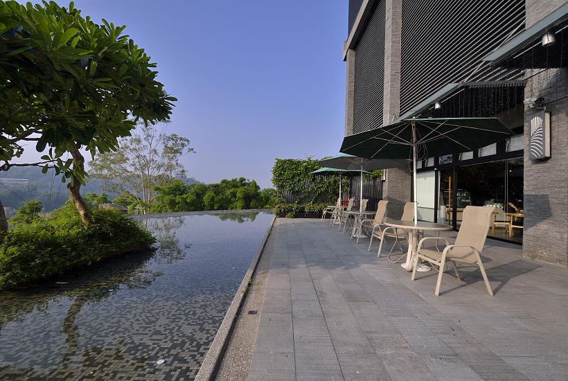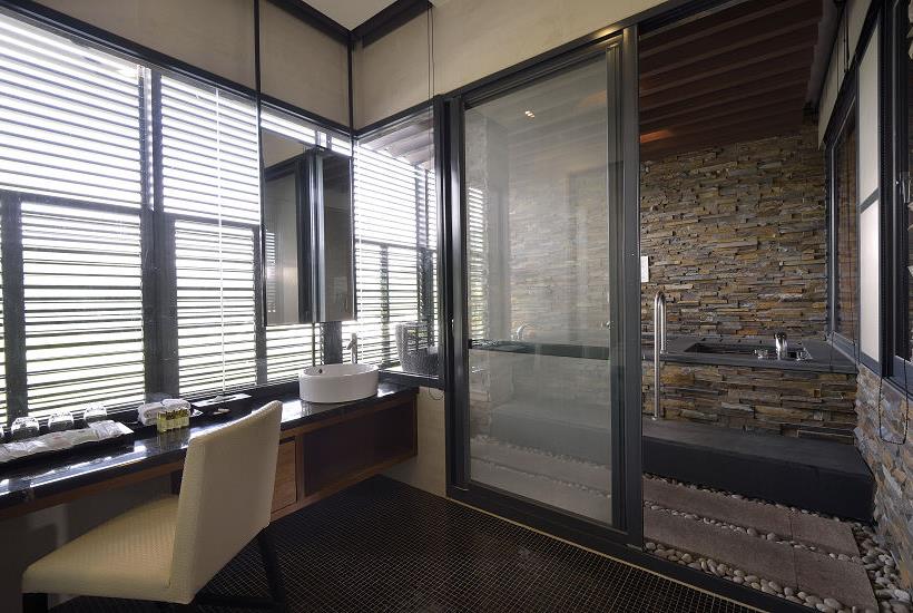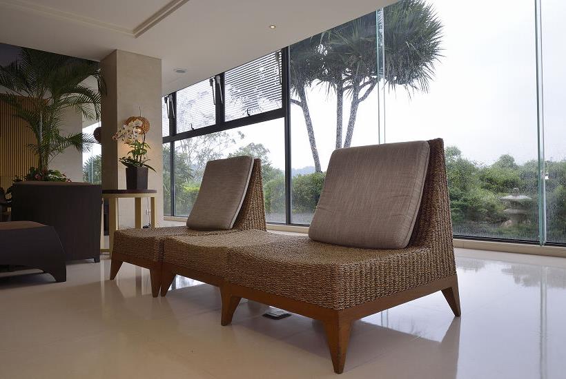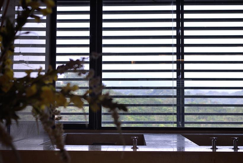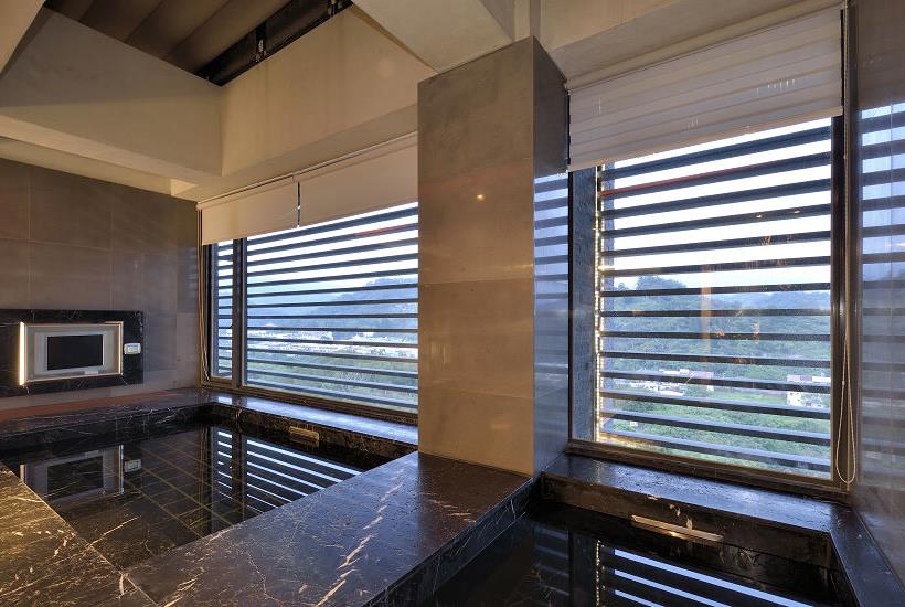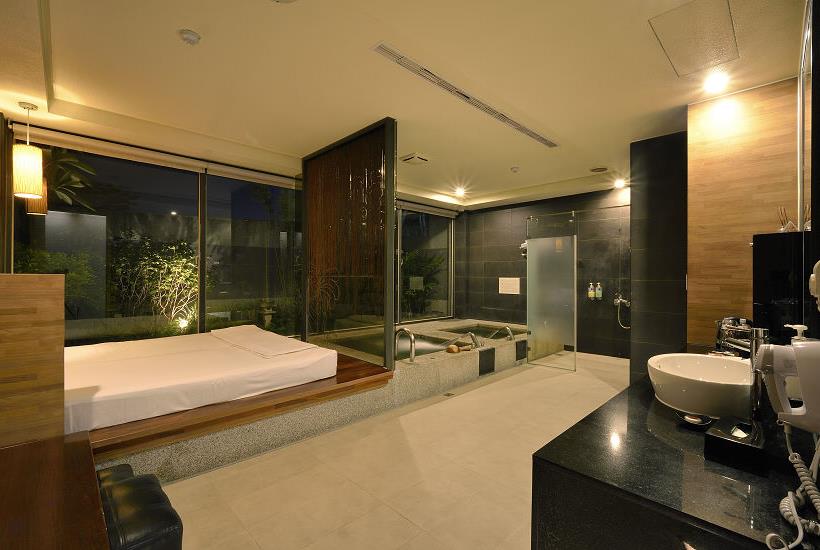 日光溫泉外觀內斂典雅的黑觀音石,烘托建築物獨特沉靜氣度,簡潔線條建構舒適空間,