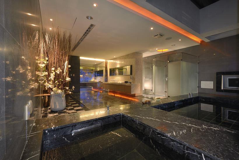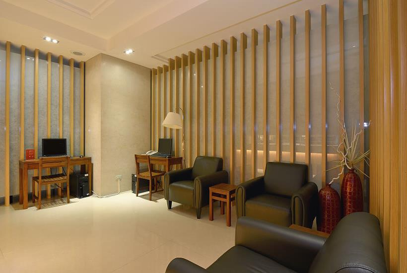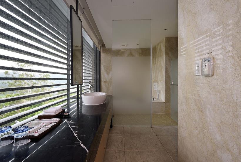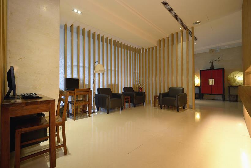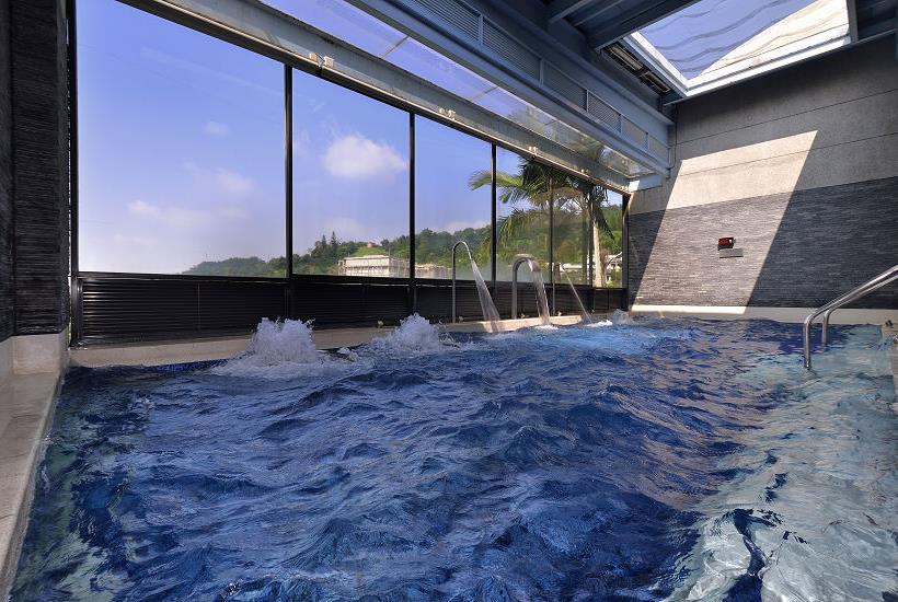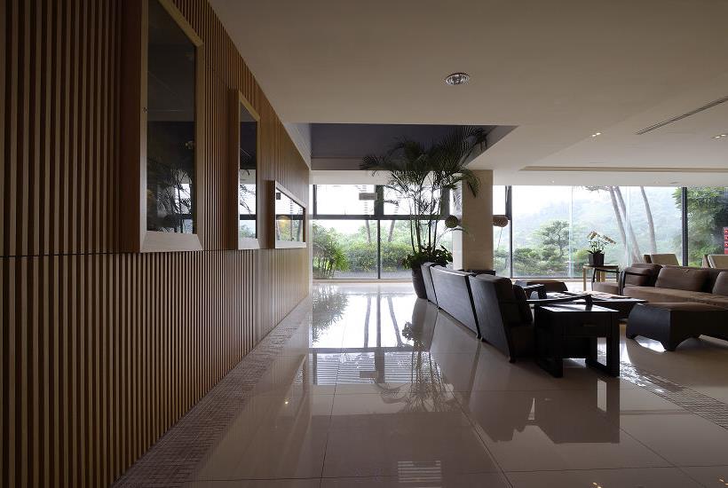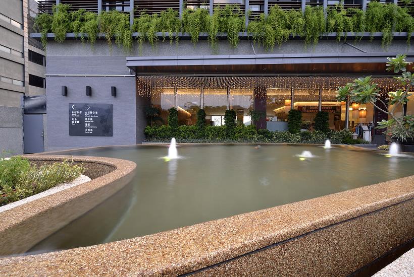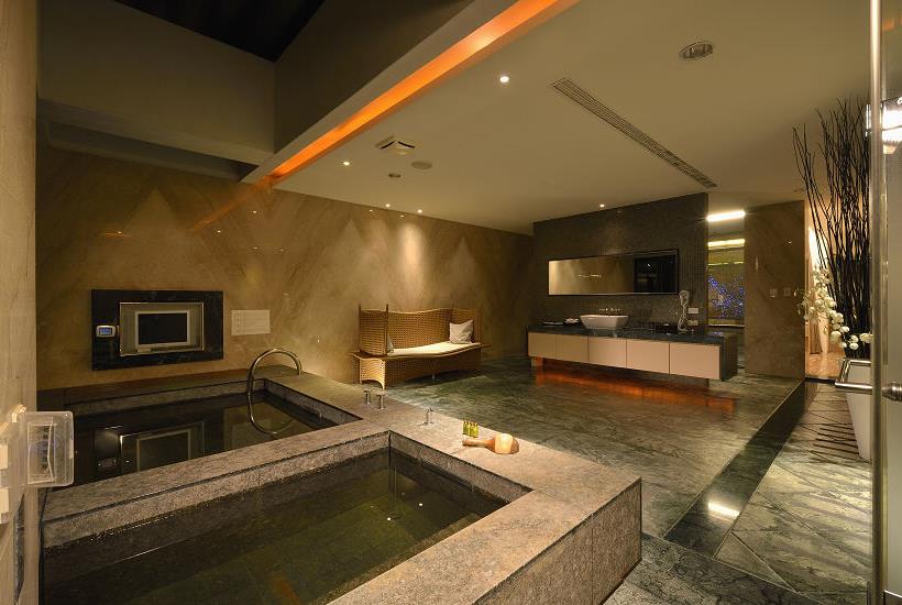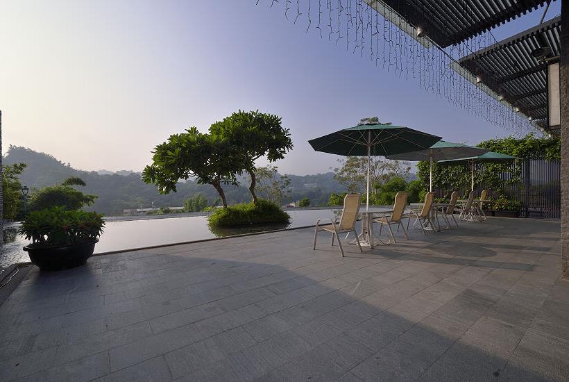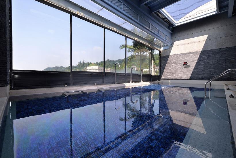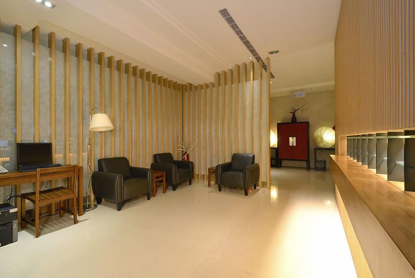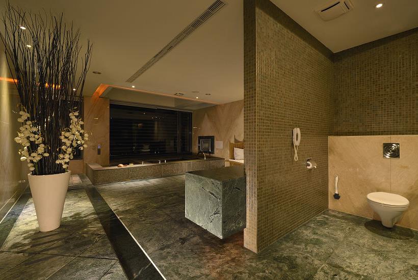 日光溫泉外觀內斂典雅的黑觀音石,烘托建築物獨特沉靜氣度,簡潔線條建構舒適空間,