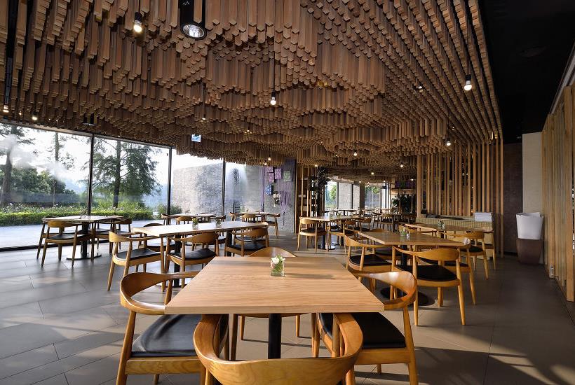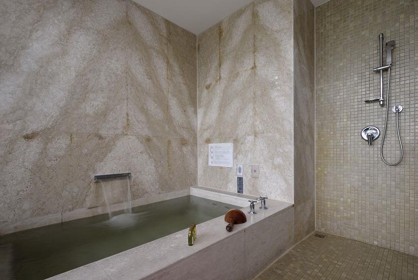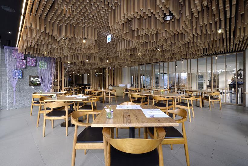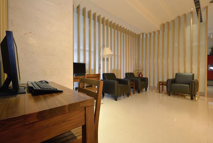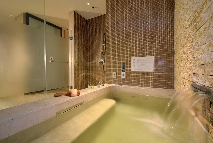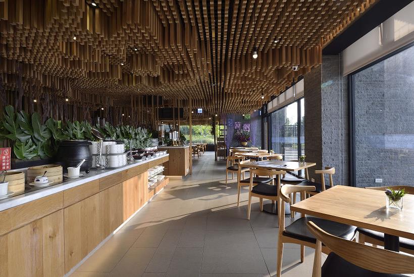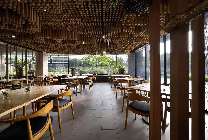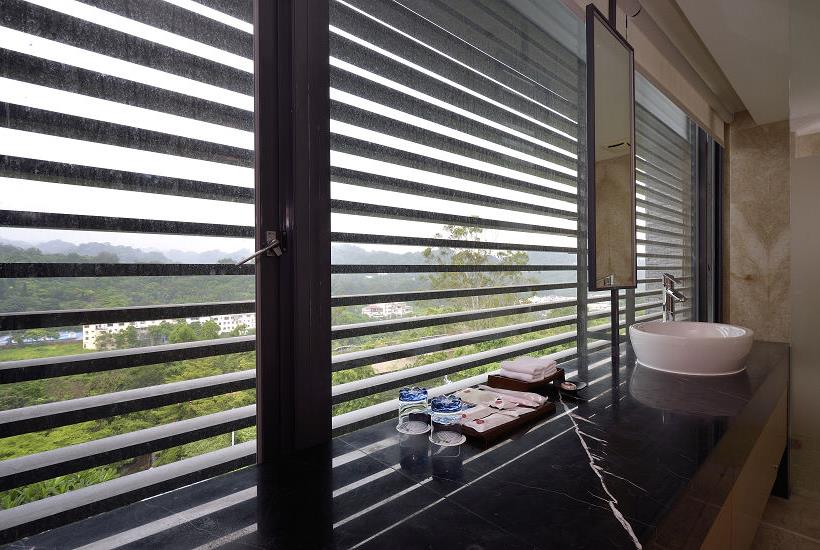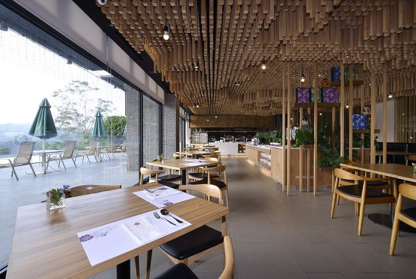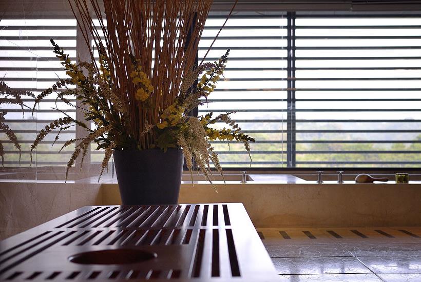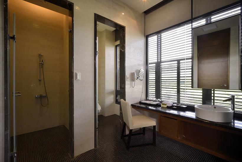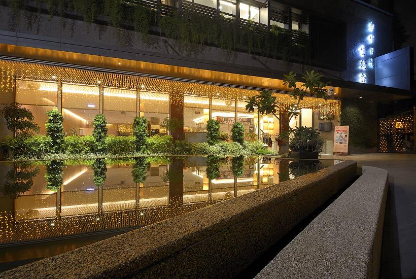 日光溫泉外觀內斂典雅的黑觀音石,烘托建築物獨特沉靜氣度,簡潔線條建構舒適空間,