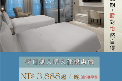優惠促銷 走過路過不要錯過正在優惠中的飯店 台中市 【台中薩圖恩文旅】延遲退房專案 $1,380TWD起 $9,880TWD 花蓮縣 【立閣人文旅店】漫遊新城三天兩夜專案 $5,598TWD起 $7,200TWD 台中市 【草悟道文旅】「遊玩草悟-呷飽飽」 (含早餐) $1,500TWD起 $4,800TWD 宜蘭縣 【天送幸福和苑】冬季鍋物一泊三食包棟專案♨ $16,200TWD起 $33,000TWD 台南市 【台南富驛時尚酒店】一般訂房|含早餐 $2,900TWD起 $6,600TWD 宜蘭縣 【松風文旅】【輕旅行】不含早餐住房專案 $2,588TWD起 $7,700TWD 更多優惠促銷推薦 從哪裡開始 從哪裡開始您的精彩旅程? 北台灣旅遊 台北市 目前有9個優惠促銷 新北市 目前有39個優惠促銷 基隆市 目前有6個優惠促銷 桃園市 目前有41個優惠促銷 宜蘭縣 目前有24個優惠促銷 新竹 目前有0個優惠促銷 更多北部住宿景點推薦 中台灣旅遊 苗栗縣 目前有2個優惠促銷 彰化縣 目前有0個優惠促銷 台中市 目前有104個優惠促銷 南投縣 目前有4個優惠促銷 更多中部住宿景點推薦 南台灣旅遊 嘉義 目前有29個優惠促銷 雲林縣 目前有11個優惠促銷 台南市 目前有1個優惠促銷 高雄市 目前有9個優惠促銷 屏東縣 目前有0個優惠促銷 更多南部住宿景點推薦 東台灣旅遊 花蓮縣 目前有25個優惠促銷 台東縣 目前有0個優惠促銷 更多東部住宿景點推薦 離島旅遊 澎湖縣 目前有0個優惠促銷 金門縣 目前有0個優惠促銷 連江縣 目前有0個優惠促銷 更多離島住宿景點推薦