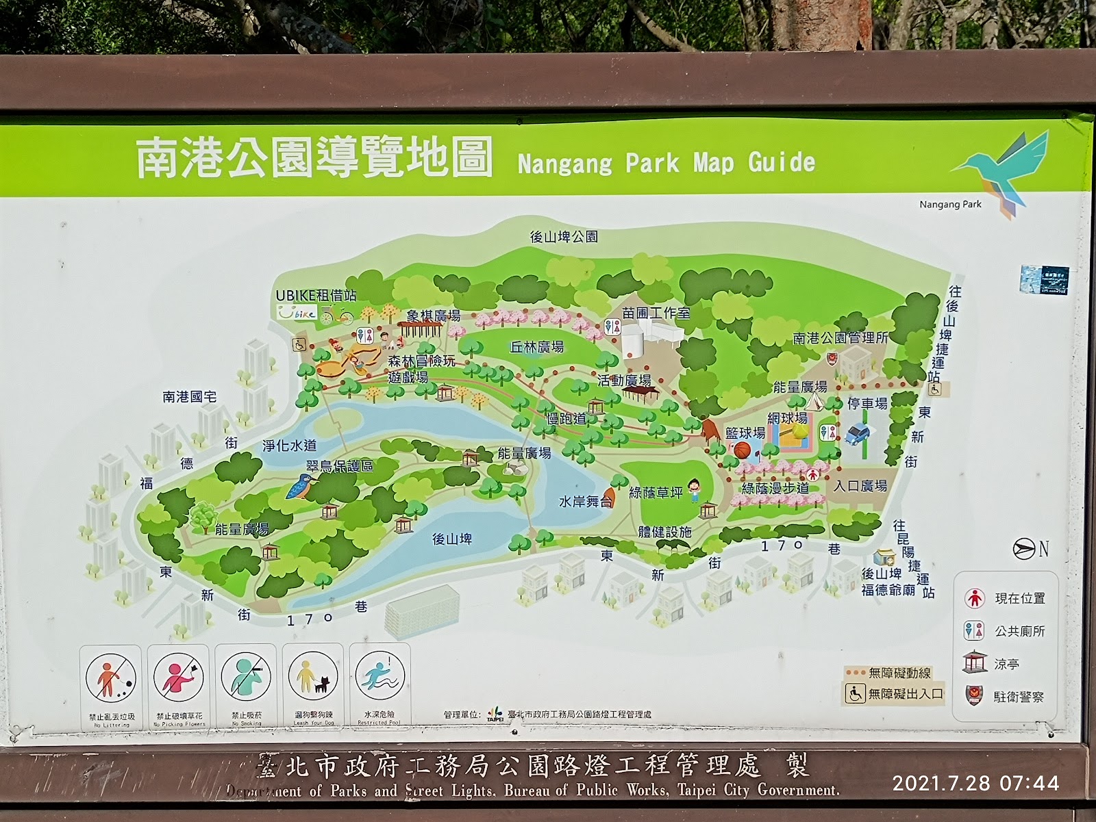 南港公園夠大!夠美!也夠周全,可也散步、可以跑步(有專設的塑膠跑道)、有小山健行步道,有水池(滯洪池)、有釣魚埸、有共融設施、有籃球場、網球場、有象棋場、最特別的是有三個能量磁場及平面收費停車場,想想只差不能划船了。