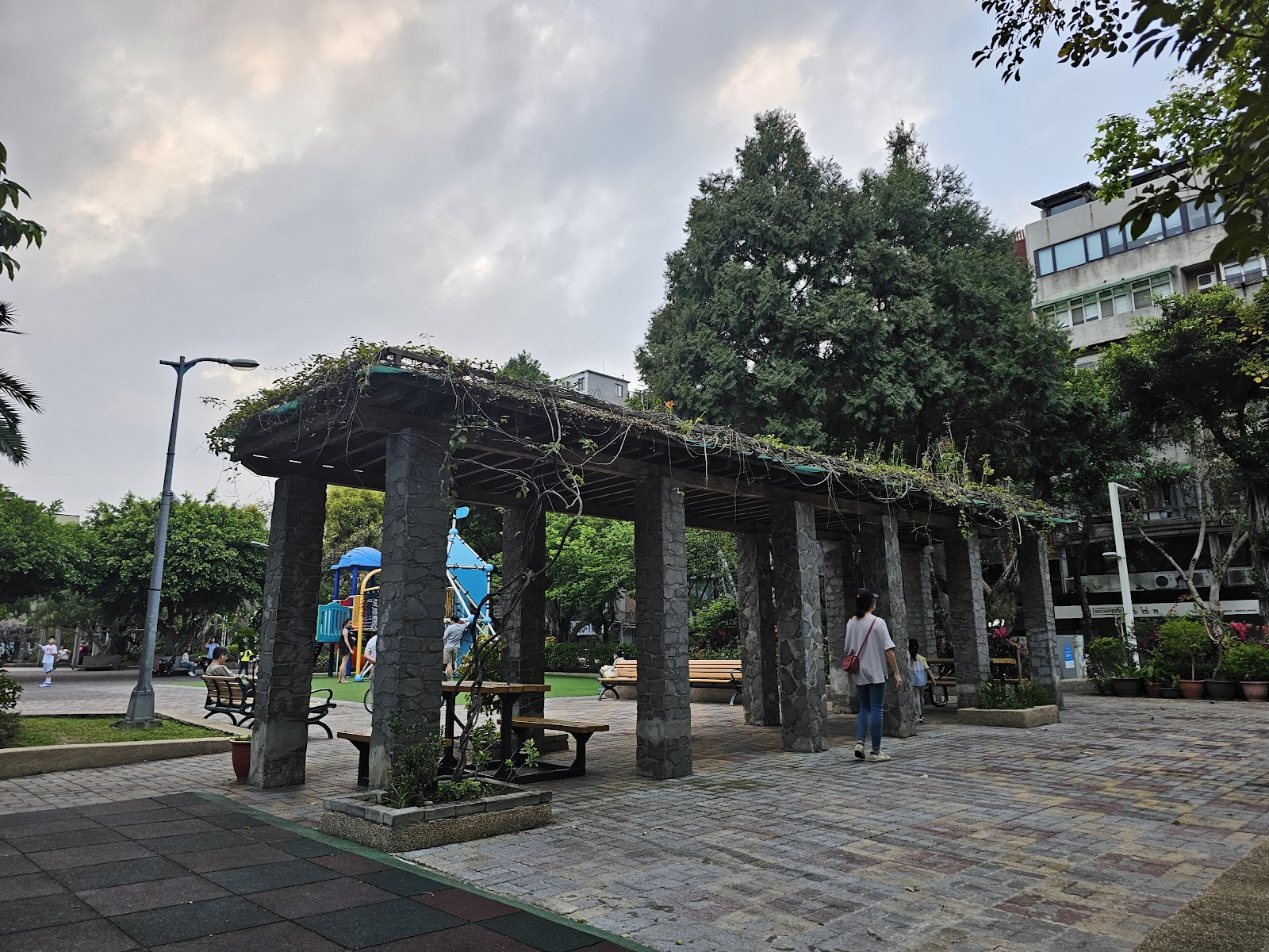 遊戲區旁邊有涼亭、樹蔭,旁邊的空間夠大,適合小孩跑跳