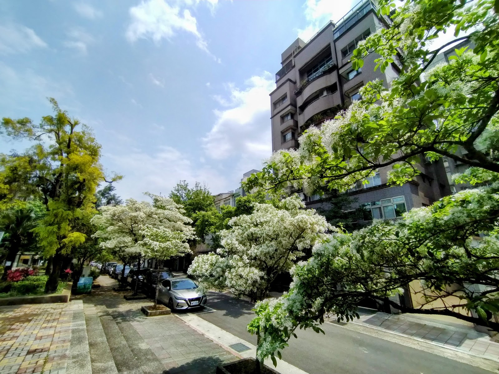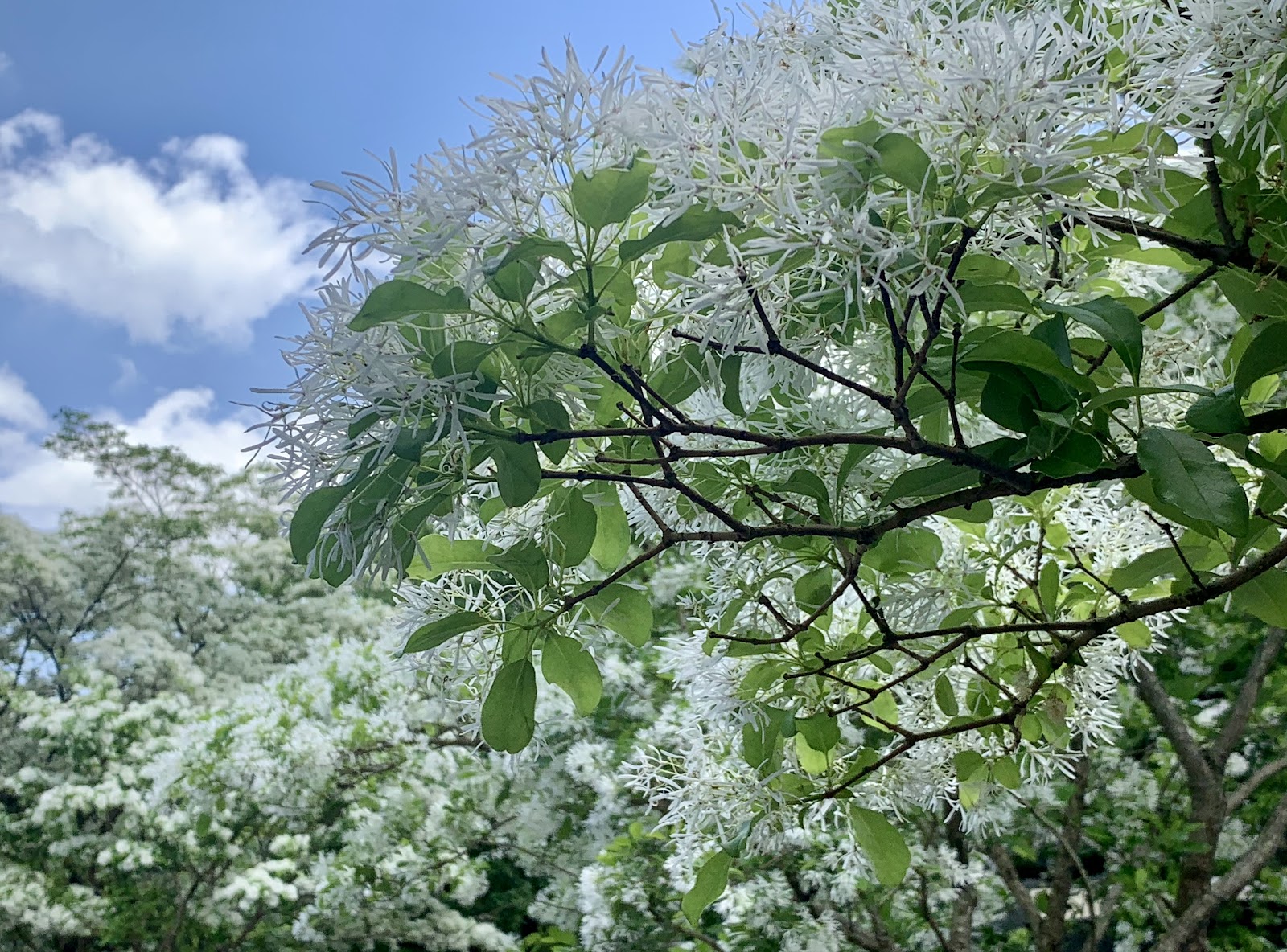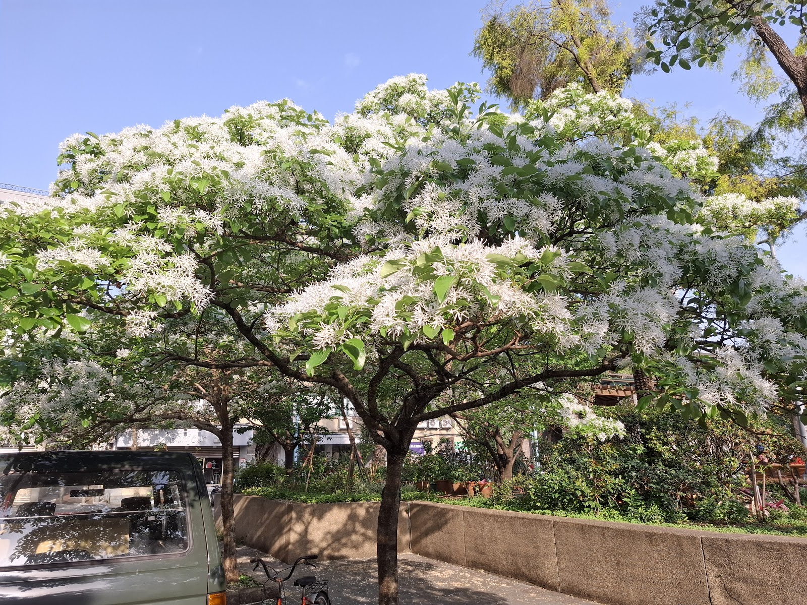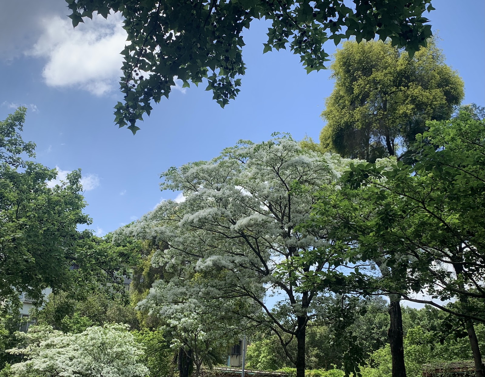 公園涼亭旁靠路邊的6、7株流蘇開花了,美麗的四月雪在陽光下隨風搖曳著,喧囂城市裏的小公園一角,還有少許尚未謝幕的紫藤和炮仗花,值得駐足欣賞片刻。