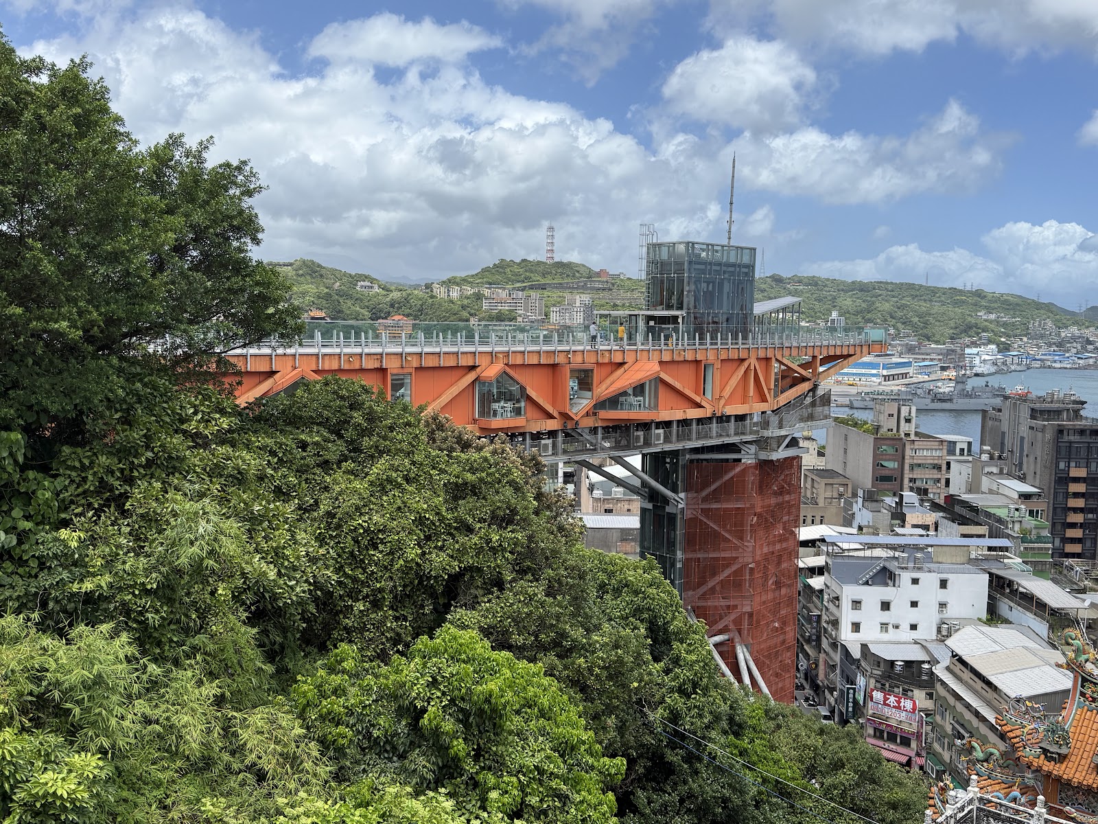我們搭電梯向上移動,就是「中正公園扇形廣場」,這裡設置有涼亭和椅子可供休憩。接著走了不少階梯再往上,到達基隆塔的五樓,它是以“起重機”為造型,由於後方是主普壇(橘黃色屋頂),所以,整個建築結構都是橘色。走了約80米長的天空步道,路面凹凸不平,腳下可得小心。越往前走,殺了不少底片....搭配上藍天白雲,真的太好拍了!