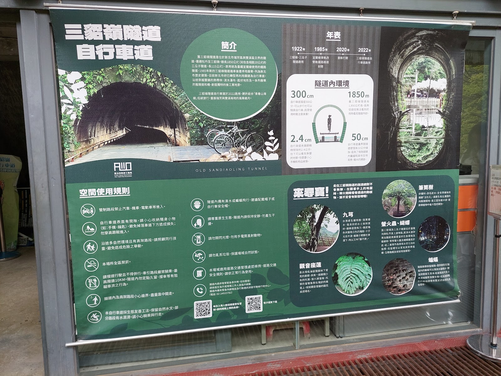 入場需網上先預約,依時段開放,每1個時段以1小時為區隔,自8:30開始至16:30分結束,每個時段預約名額為160位。 1985年新的三貂嶺隧道通車後遭停用廢棄,列為新北市歷史建築,目前新北市府已轉型再利用闢建為自行車道,沿途穿越豐饒的熱带林、流水瀑布、起伏地形及一系列廢棄的舊隧道和橋,創造獨特的後工業地景。現在大部分的人都走路健行於隧道享受隧道內的冰涼體感。