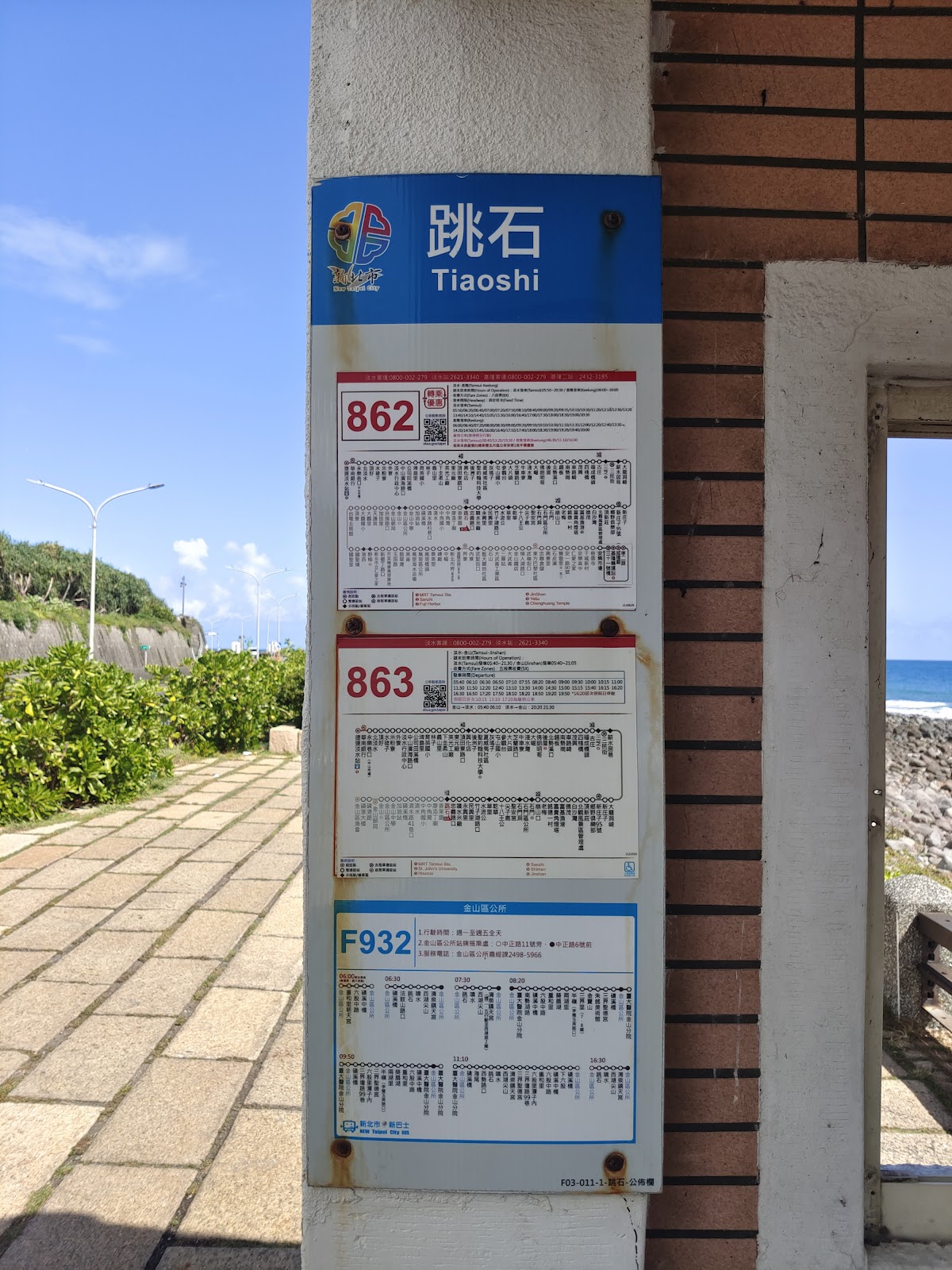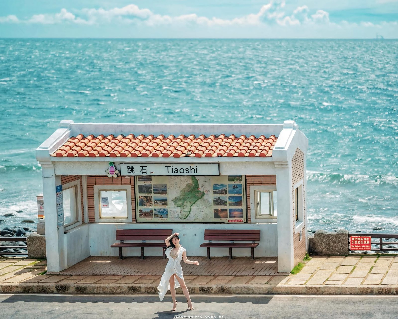 在跳石海岸上的跳石公車站,背面就是浩瀚的大海,景色非常優美,號稱《台灣最美的公車站》吸引無數旅人專程來此拍照打卡。