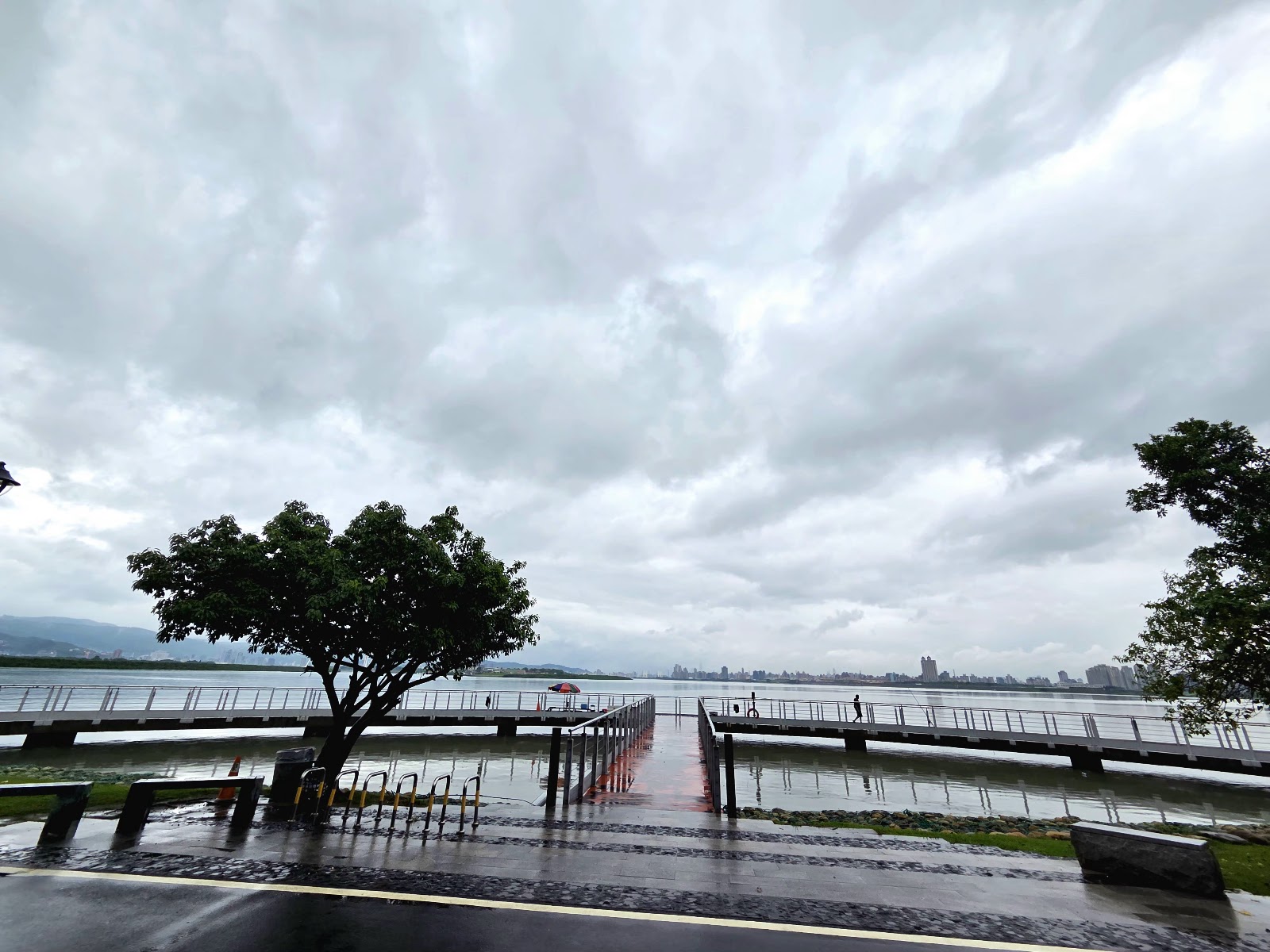 可以眺望社子島島頭公園、基隆河、淡水河的匯流處,天氣好的時候,遠處台北的城市天際線都可以看的很清楚。半圓形的釣魚平台上有很多人在釣魚。