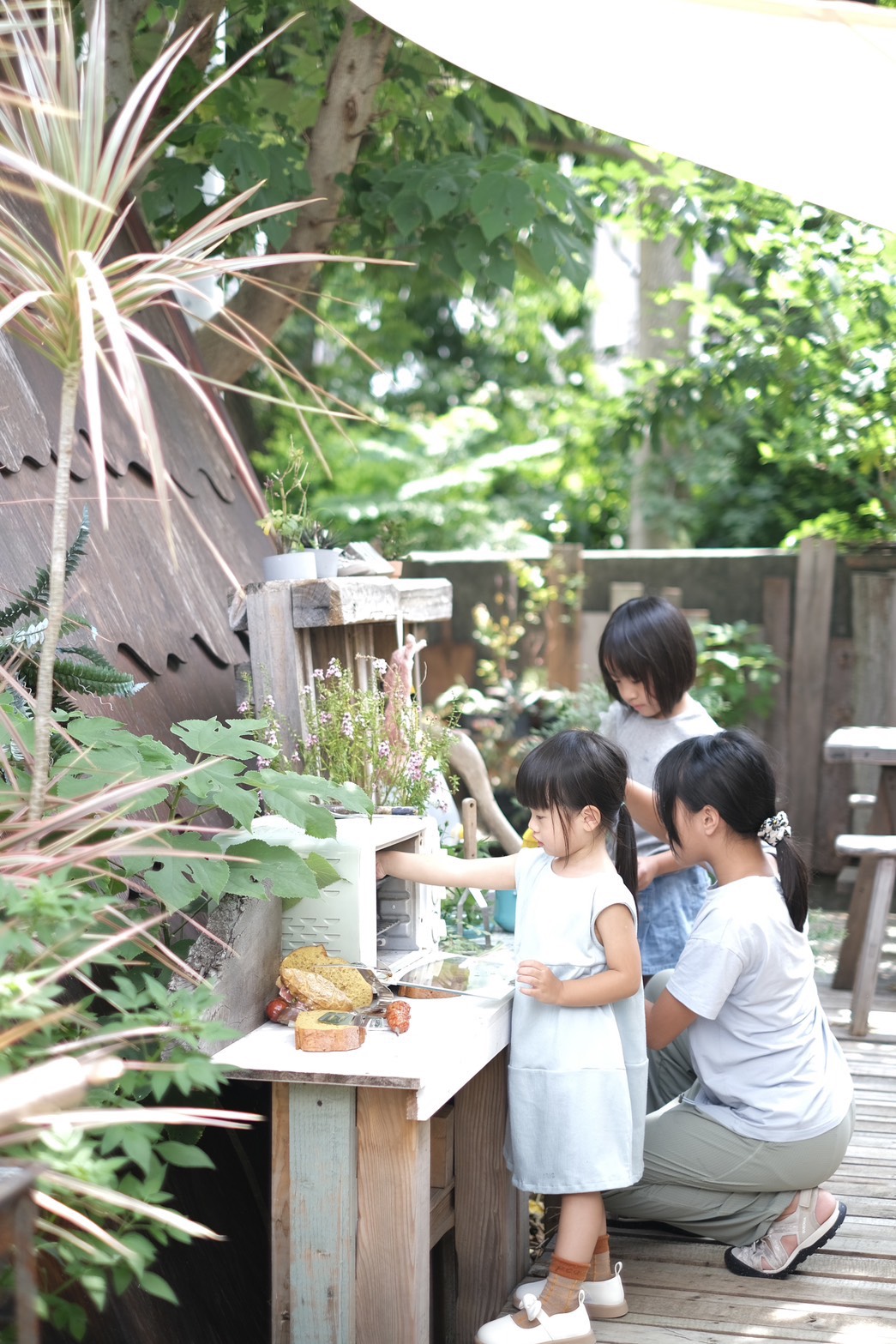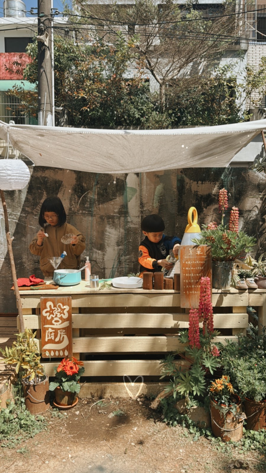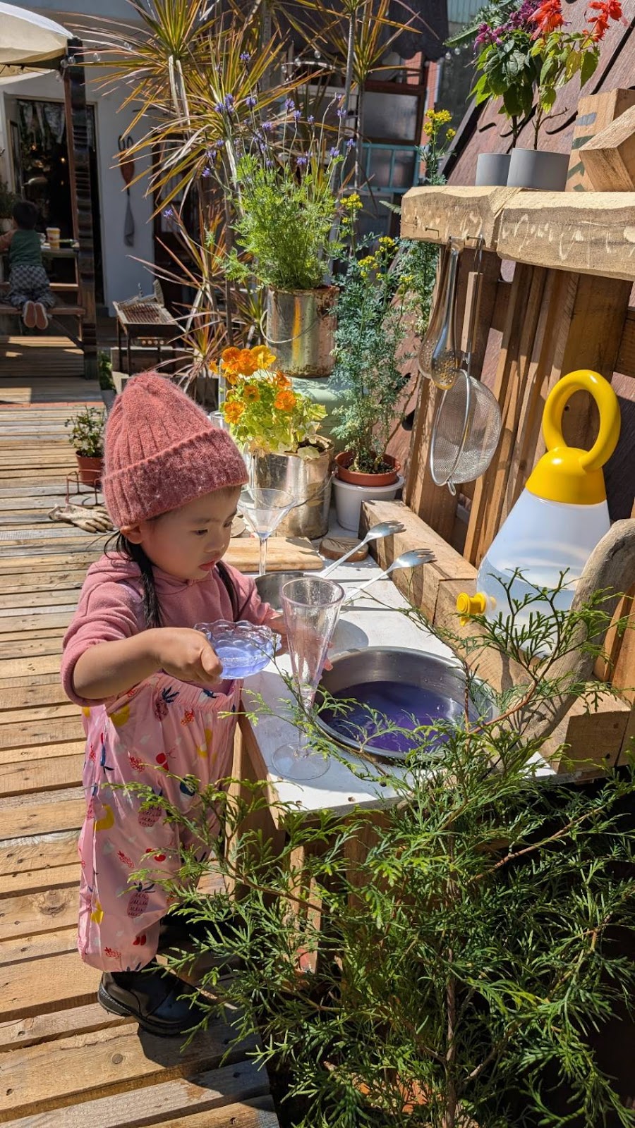 後院的開放空間裡有各種擬真物品佈置成的花園廚房,小小孩會玩得很開心☺️