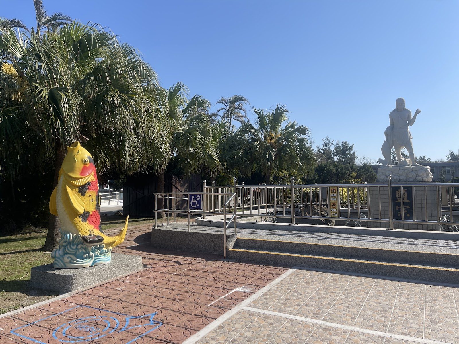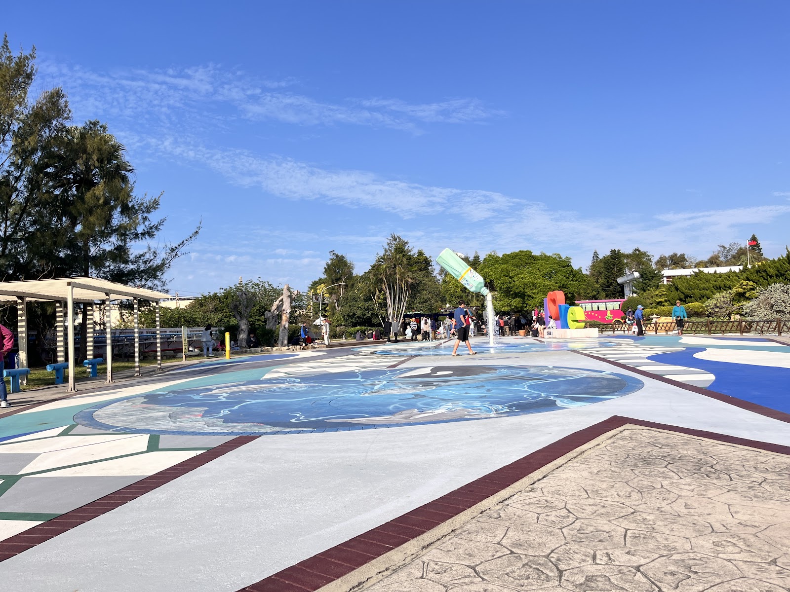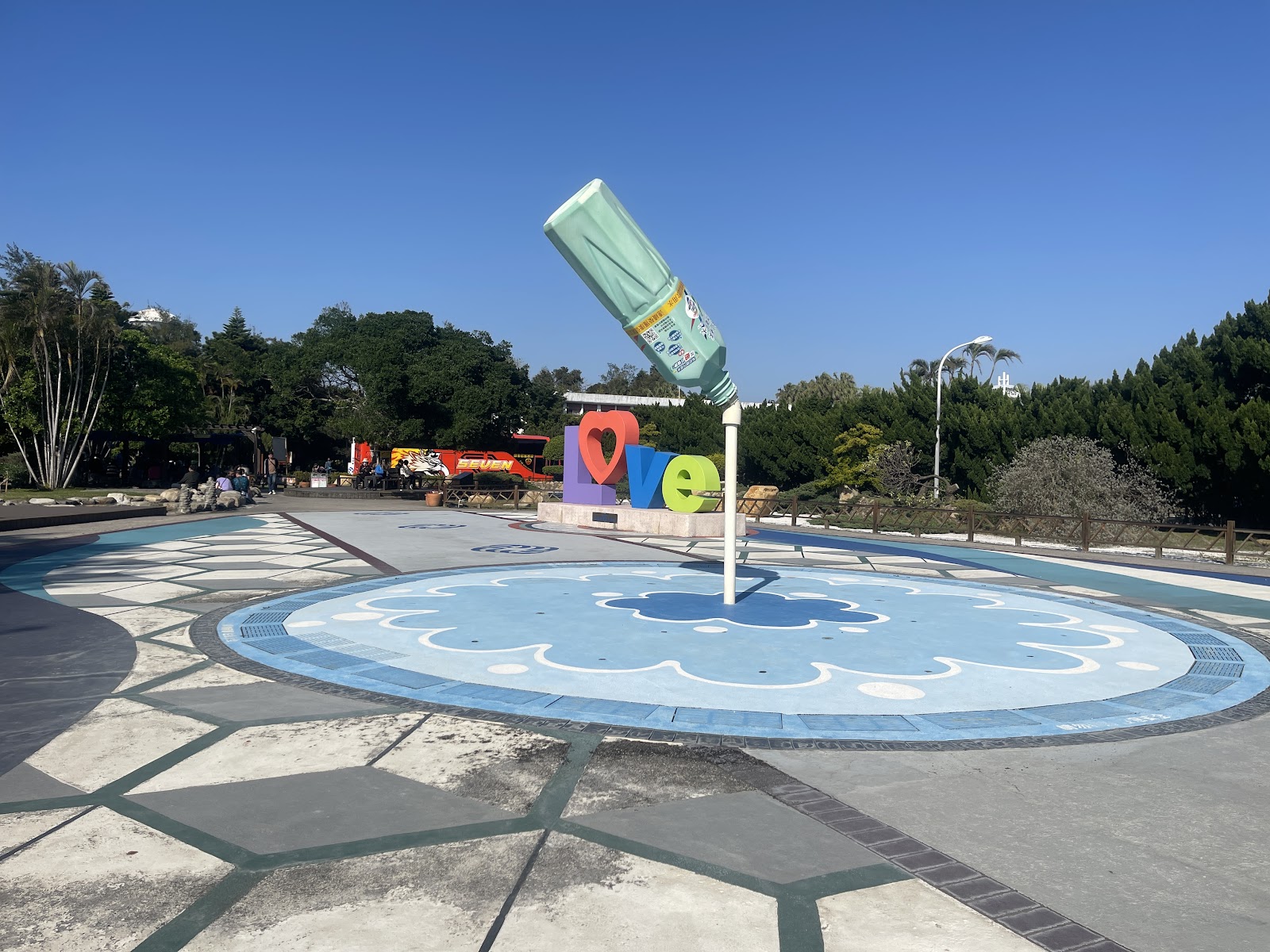 免費入園.有大的停車場.園區內有泡腳池,販賣咖啡,食物的地方,廣場中噴水池的開關在旁邊的小柱子上.