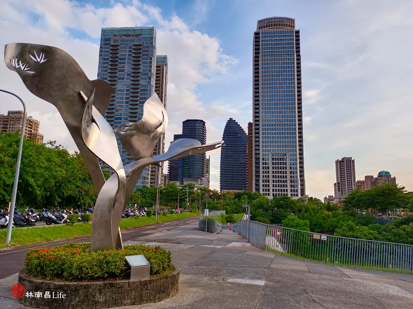 紅欄杆特別醒目,大樓倒影在湖上,拍起照片特別有氣氛,湖上有鴛鴦,可以看出環境有生態特別重視,是可以來此悠閒散步,住附近聽說都是豪宅區塊!