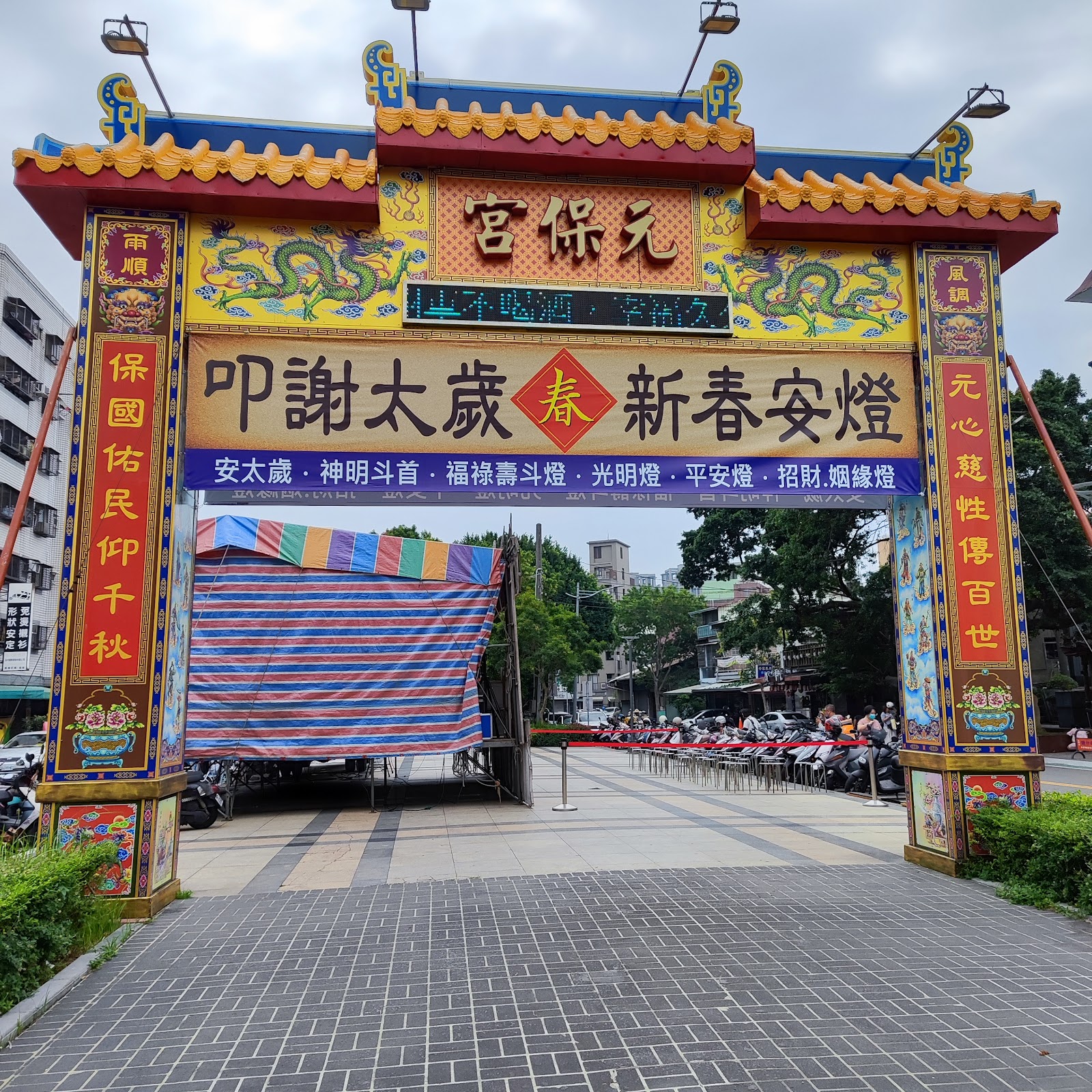 臺中市元保宮:大型遮雨棚下的元保宮主殿、牌樓、榕樹公。