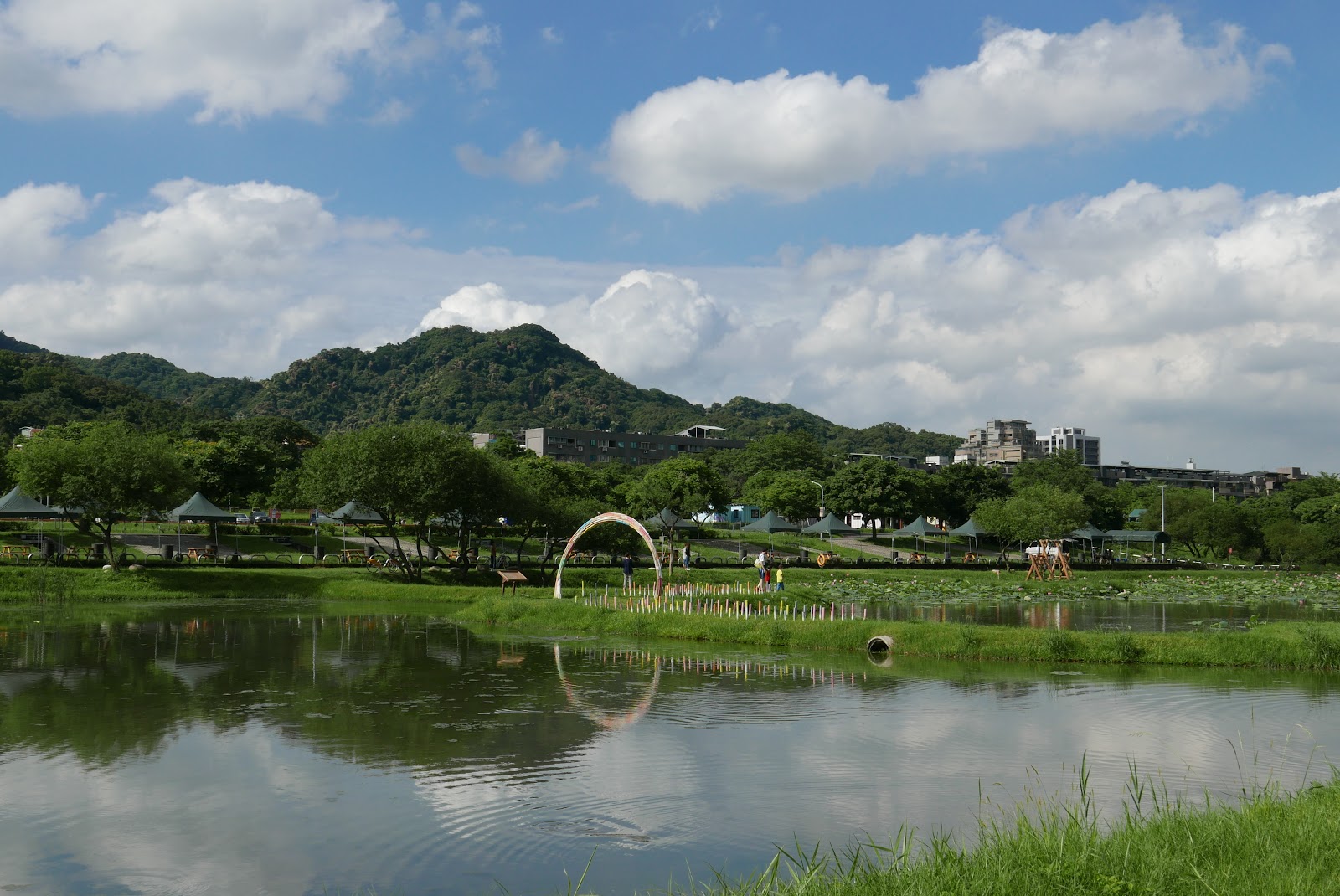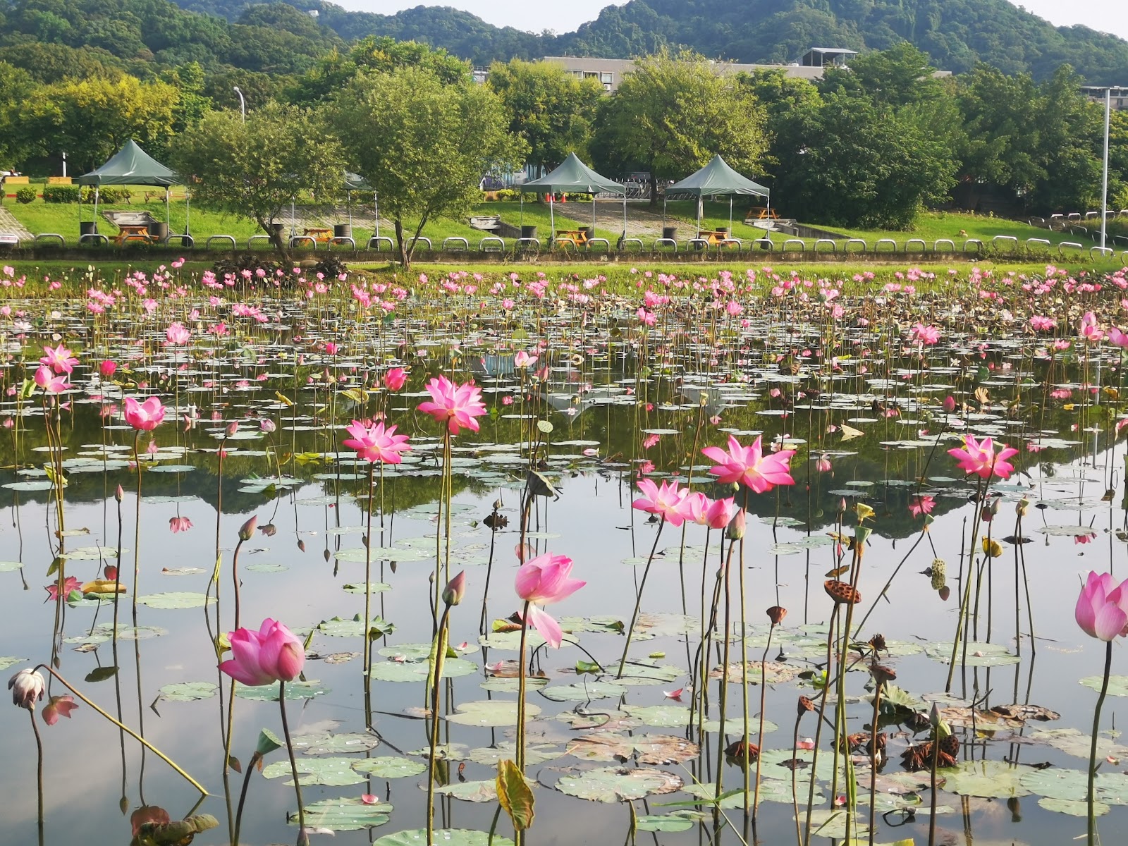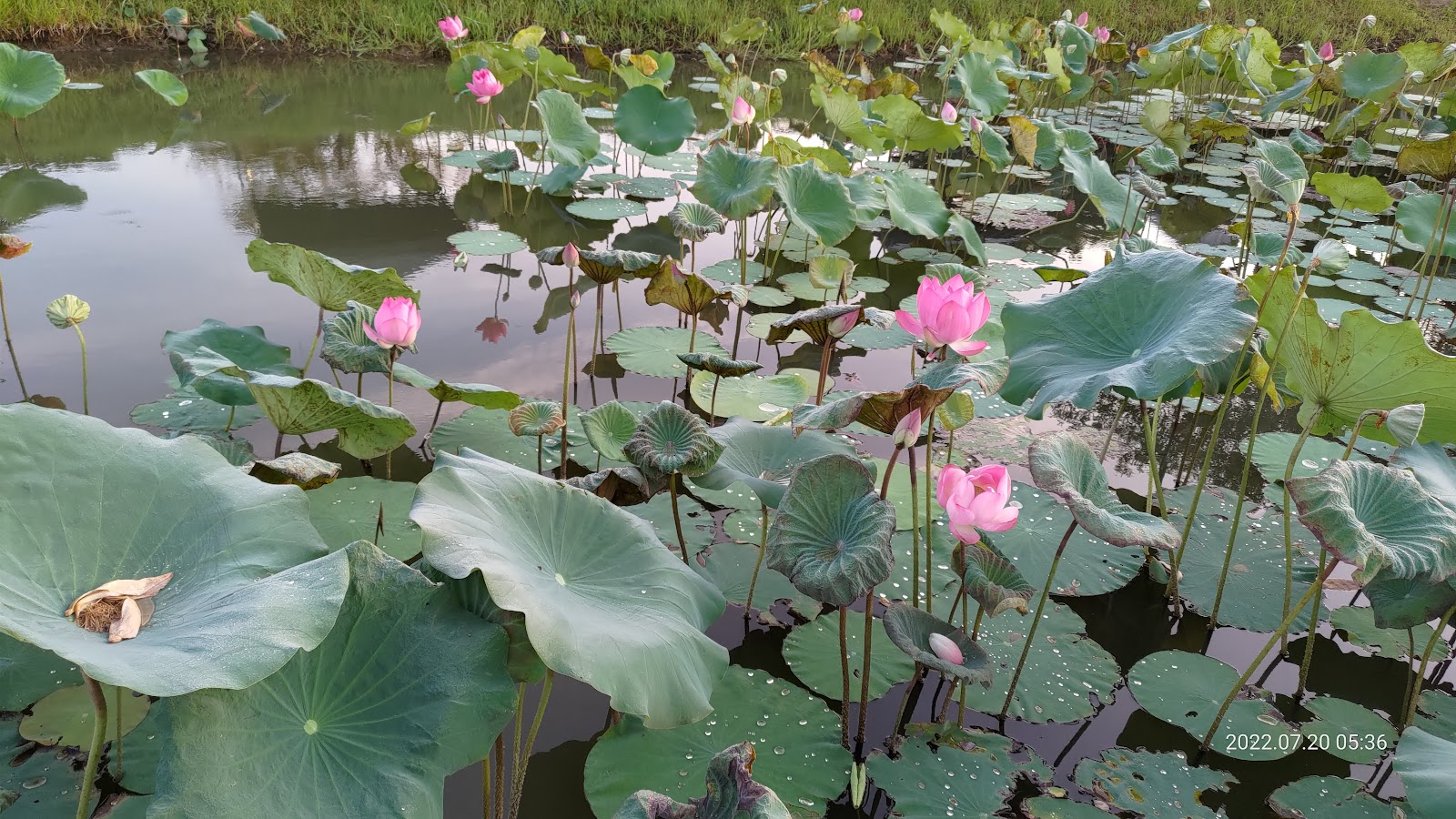 大漢溪左岸,高灘地整改後,蛻變的荷花池,適逢炎夏偶飄雲,荷葉佈滿池,粉嫩荷花綻開其中,正合那句:映日荷花別樣紅。