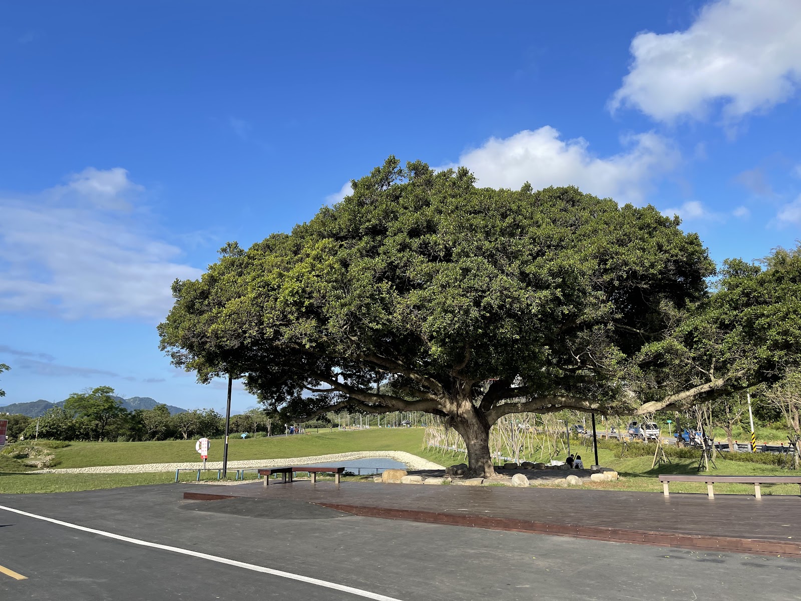 機車停車格距離步道太遠,反而汽車停車場貼近步道,除了草地有榕樹,幾乎沒有遮蔭的地方,夏季或秋季絕對會曬傷或中暑的機率,雨季更會有雷擊的危險,這規劃對小孩及年長者相當不友善。