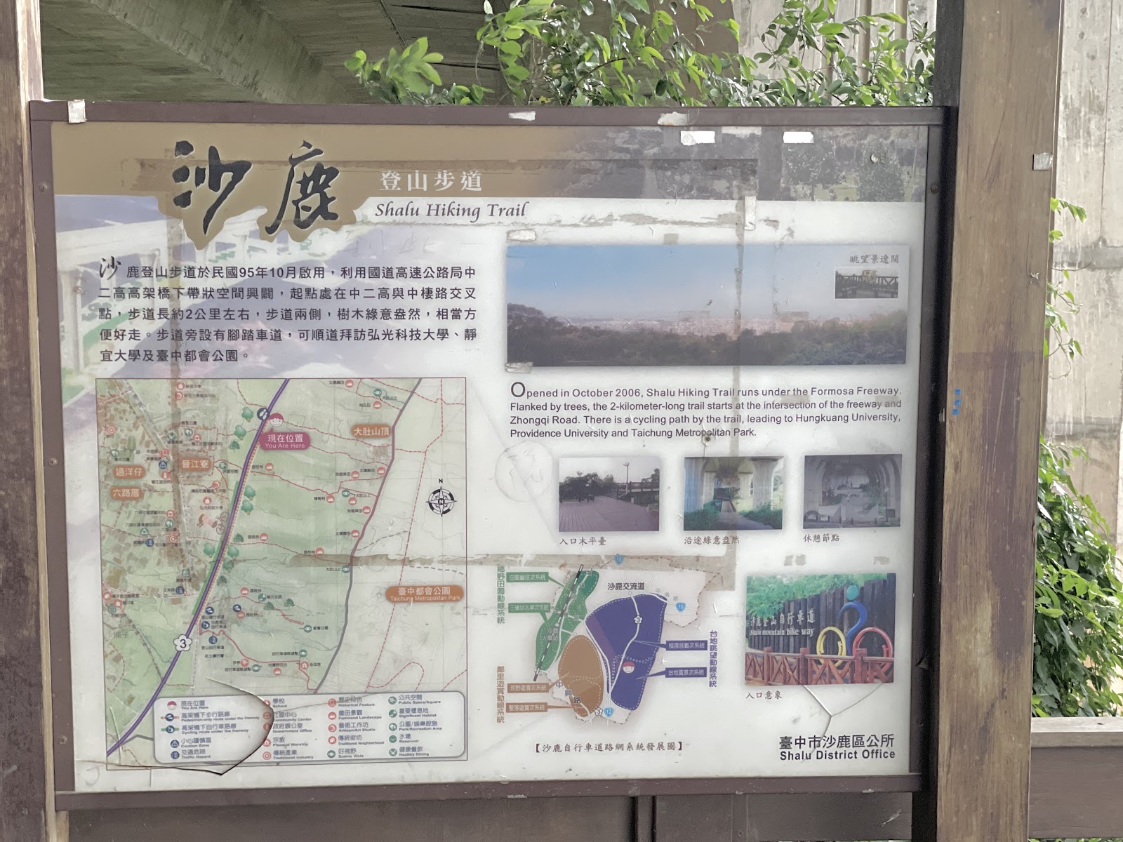 沙鹿登山健行自行車步道,曾經是網美打卡景點,入口位於台灣大道上,高速公路高架橋下,慢車道進入。靠近弘光科技大學、都會公園,可以搭乘BRT公車到正英路站,也有多處停車場可停車,步道中間有廁所。