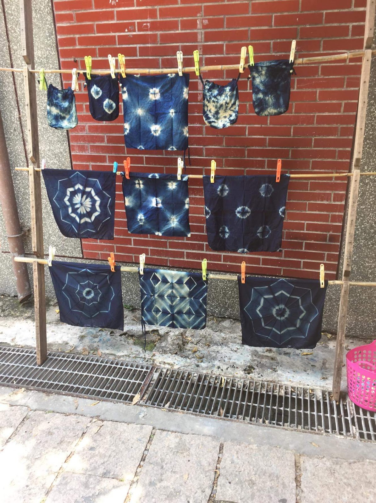 (3)最後步驟:等待氧化,將浸泡染液的布拿出來攤開,讓空氣進到布裡面,染了綠色的布和空氣結合氧化後,就變成藍色了,很神奇喔👍