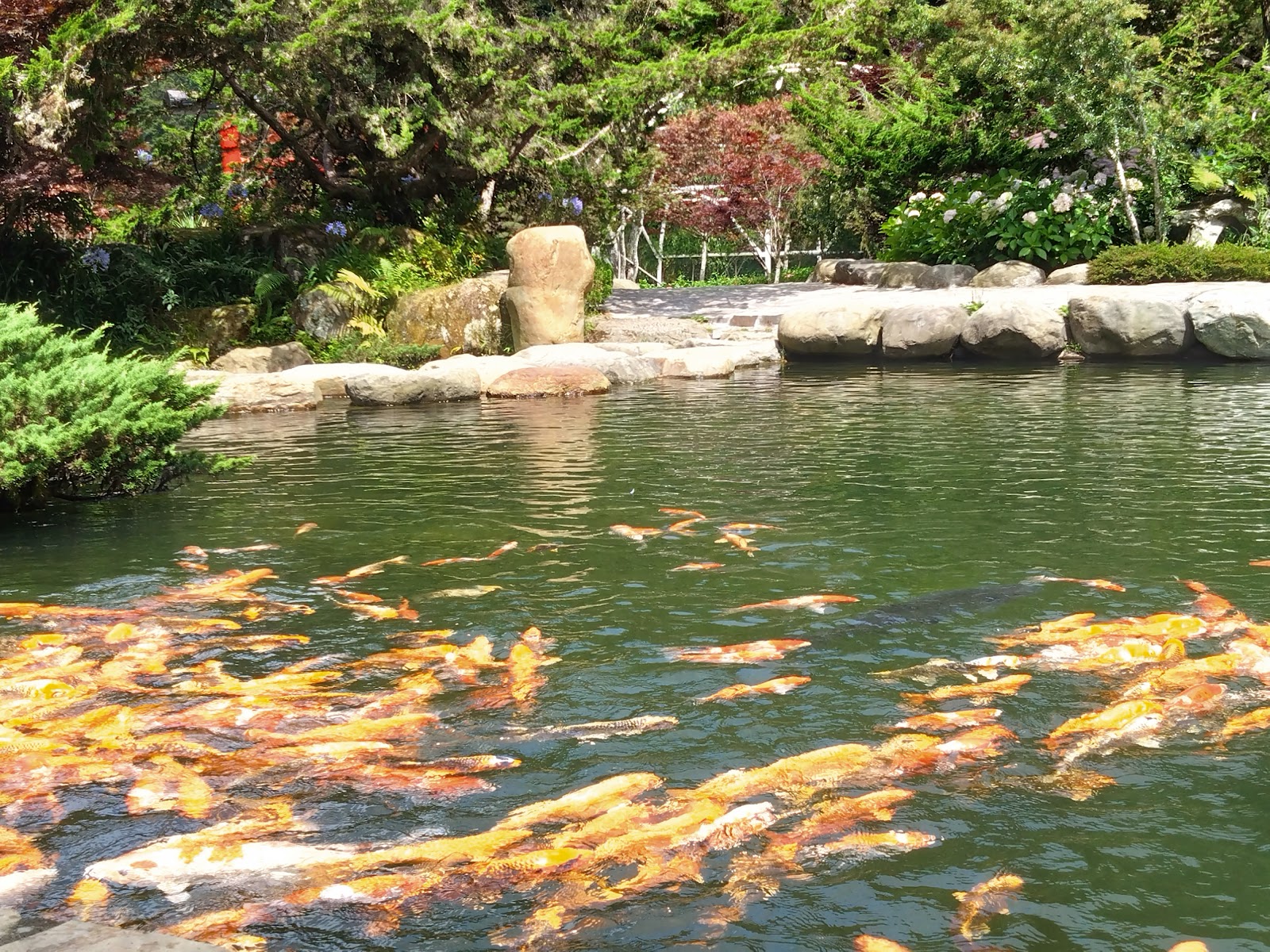 位於花卉中心內,人工修築成的池塘,水池裡放養了數百條錦鯉,成群悠游起來金光閃閃、豔紅如火;池邊種滿了繡球花,盛開時節一整片五彩繽紛,倒映在水面上,景色如詩如畫