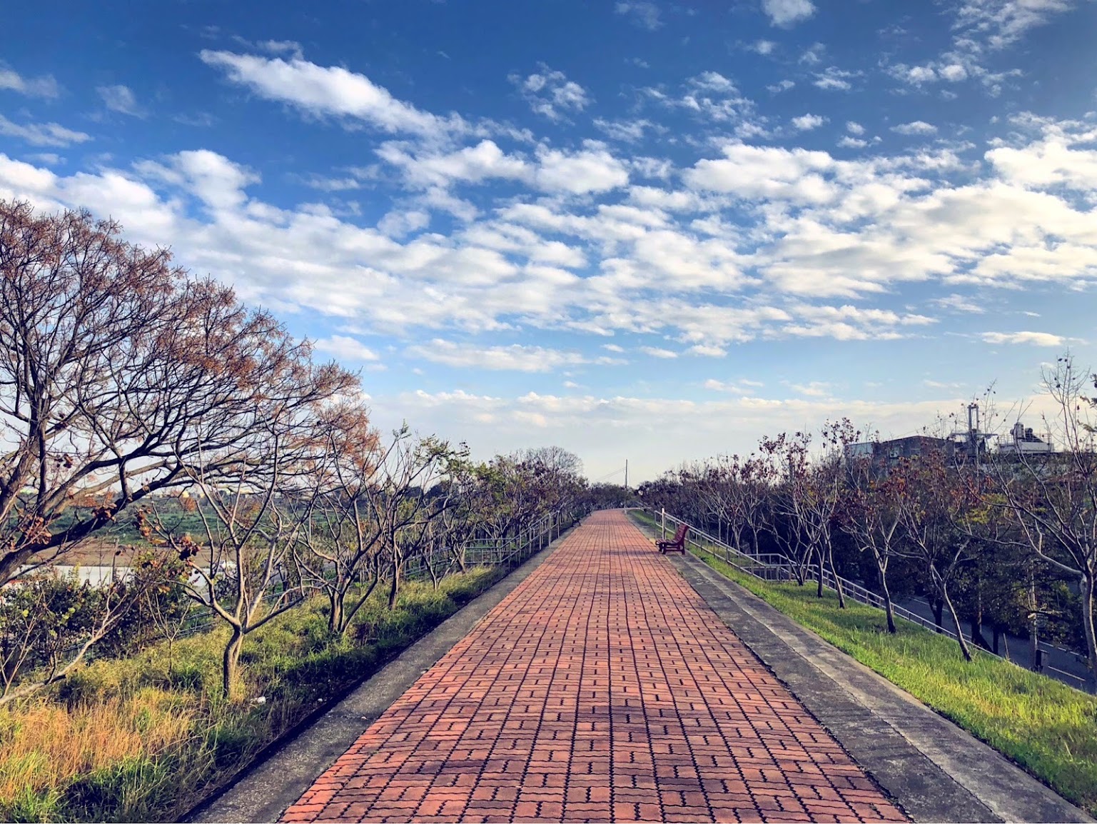 週休三日(無薪假)帶小Q出門走走:休閒散步及運動的好地方,河堤兩邊種植整排樹木,大白天有樹蔭有風吹來蠻舒適的,步道沿路都有休息座椅,而且有無障礙設施,坐輪椅的好朋友們也可以上來ㄛ!