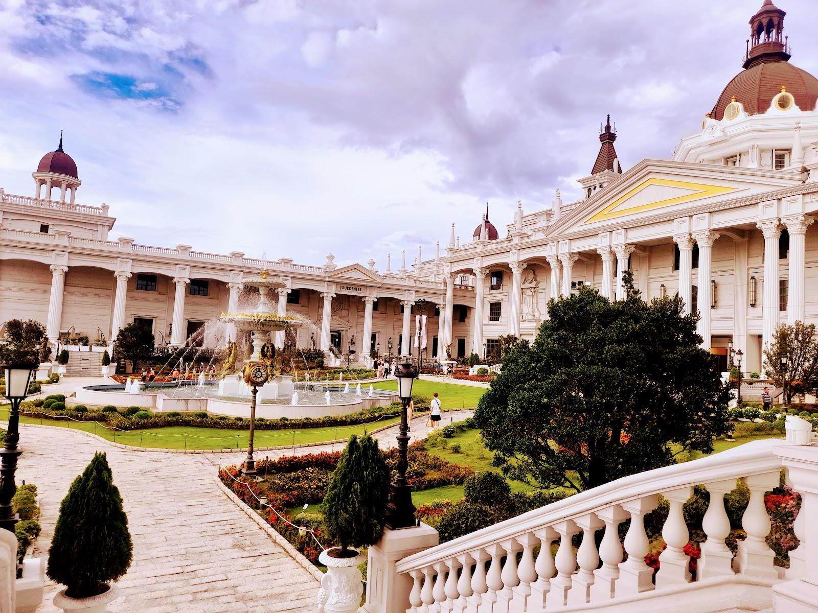 一走進去就看到整座白色城堡超壯觀、超夢幻,旁邊是花園,怎麼拍都漂亮,維護得很好。正前方的公主噴泉更是小孩最愛,一下就跑去玩。