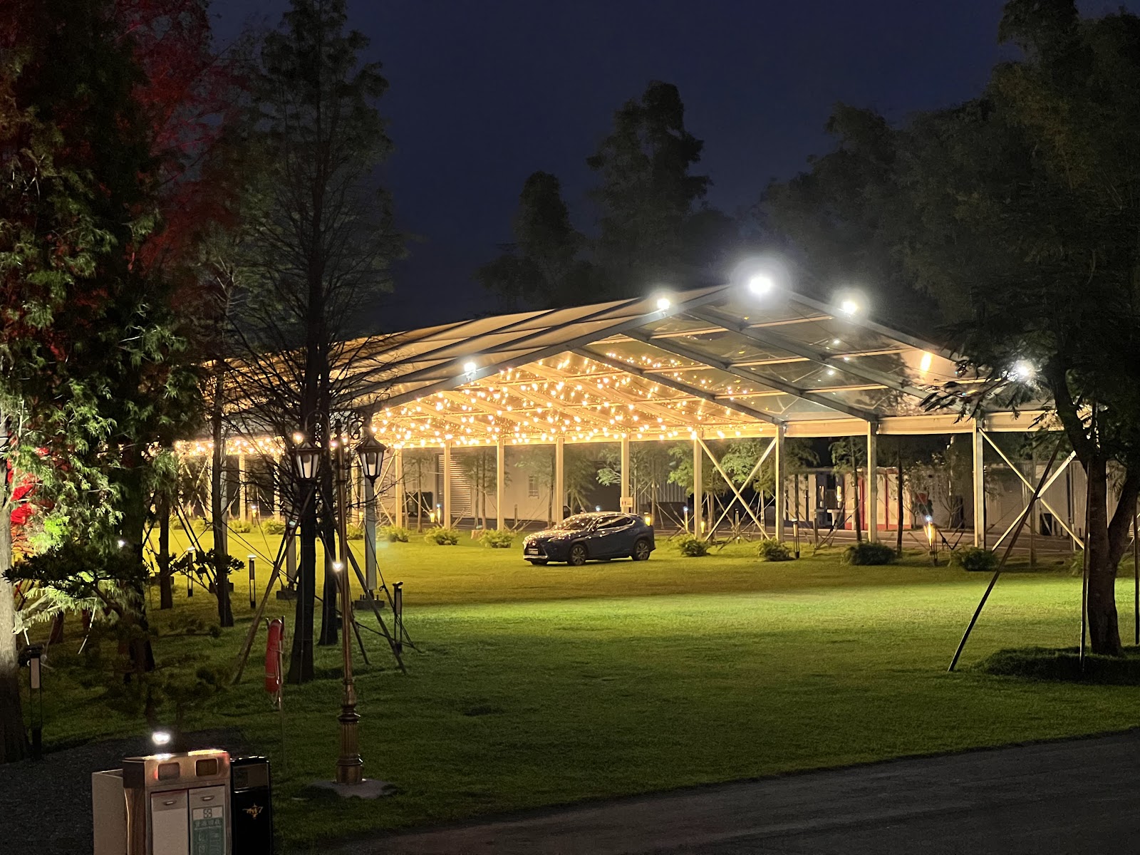 是台南目前熱門的露營區,裡內包含游泳池、各種LED燈擺設、打茶趣、舞台、露營車和錄影房