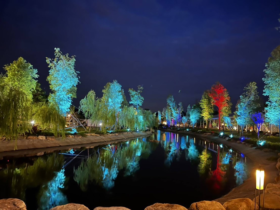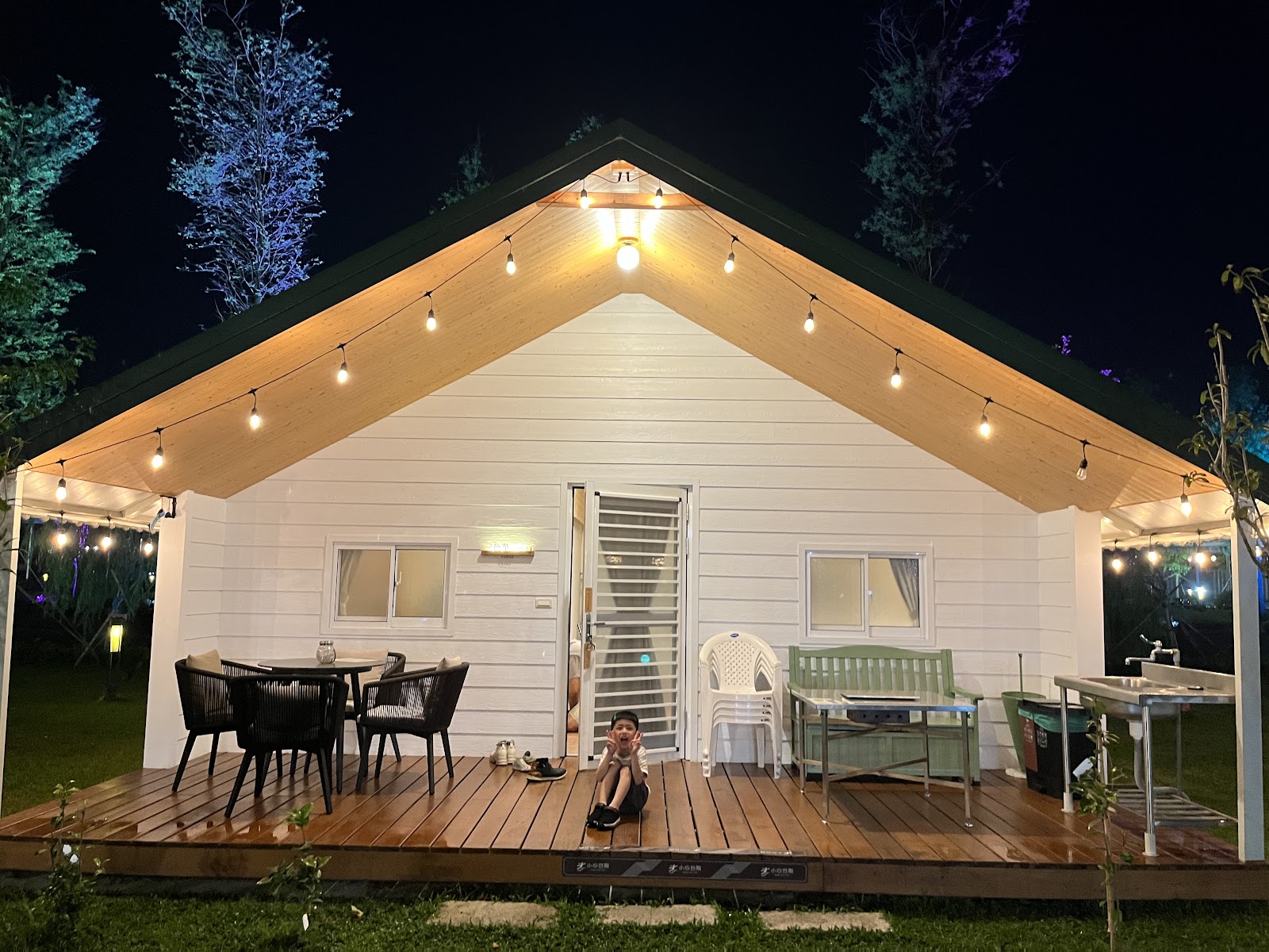 充滿綠意貼近大自然的莊園,有小木屋,露營車可住宿,烤肉,游泳,也有餐廳可用餐,可在一大片草地上遊玩及奔跑,尤其夜晚燈亮時分,真迷人。