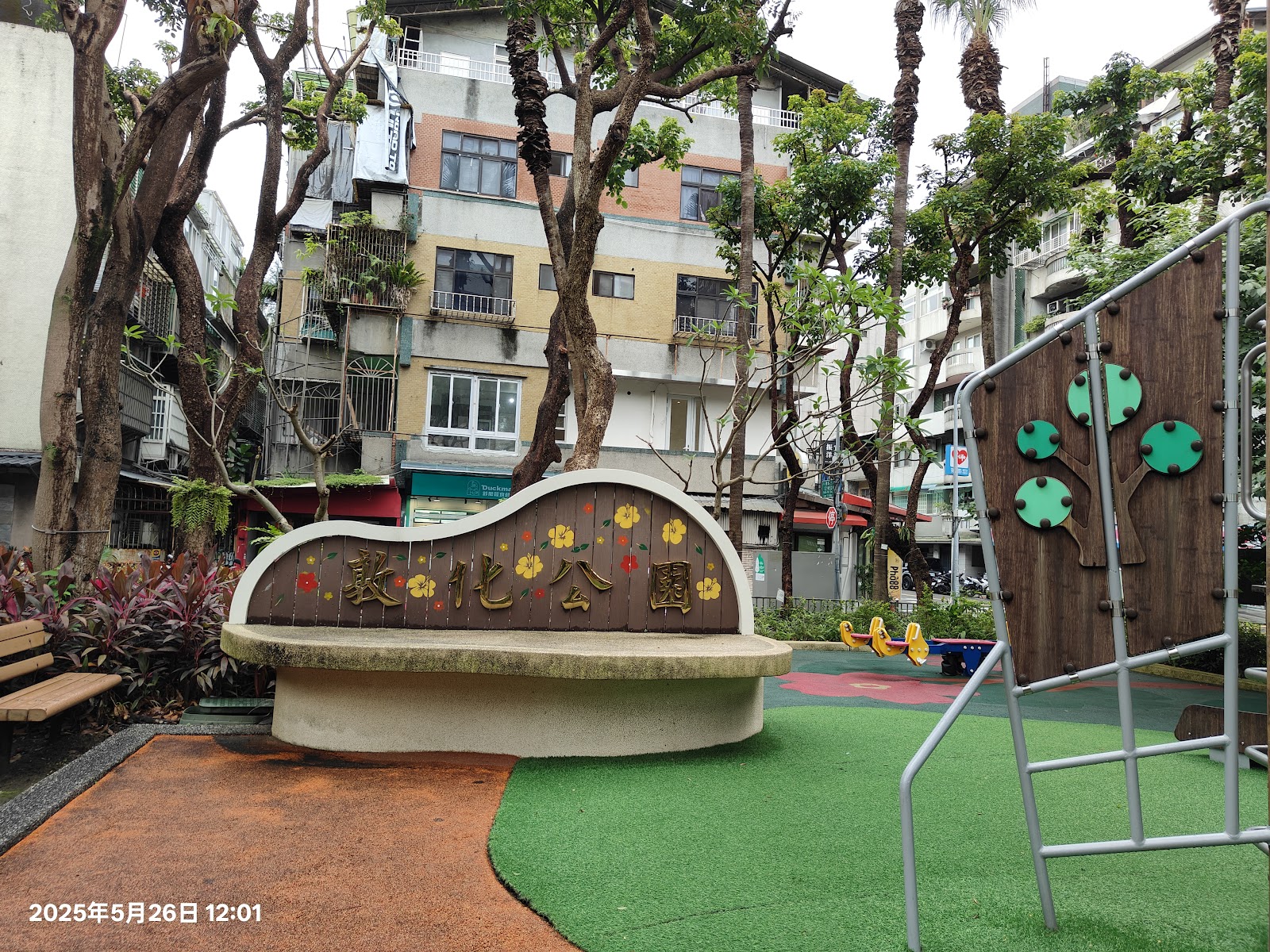 位於八德路三段巷弄內的敦化公園,1973年設立至今已有近五十年歷史,雖然佔地僅1728平方公尺,園內設施卻相當齊全,光是體健設施就有大轉輪、雙人扭腰器、單槓、整脊壓背、雙人太空漫步機、腹肌板、肩關節康復器、伸腰伸背器等。遊樂設施也不馬虎,除了組合遊具與翹翹板,兒童防護措施與活動空間規劃也都非常完善。此外,園內並設置有不少休憩設施,如座椅、搖椅、涼亭等,同時還設有直飲台與洗手台供來此運動、休憩的民眾使用,十分便利。