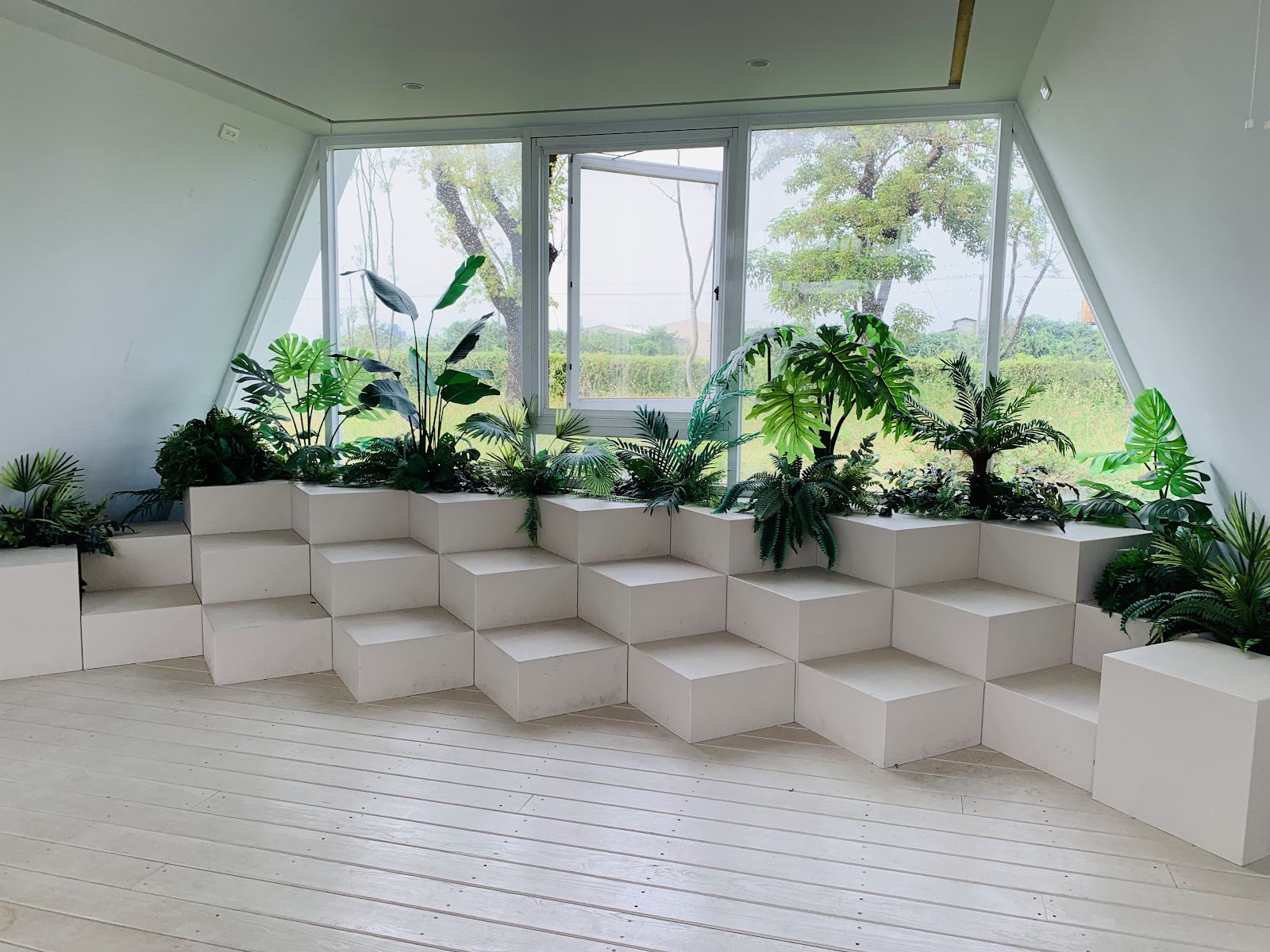 「御飯糰玻璃屋」位於台南善化光復路邊,原本是當地建設公司招待會館的附屬造景,純白色的外觀及搶眼的三角形建築外型,加上周邊植物造景,打造出簡約又療癒的風格,意外成為拍照打卡熱點 。