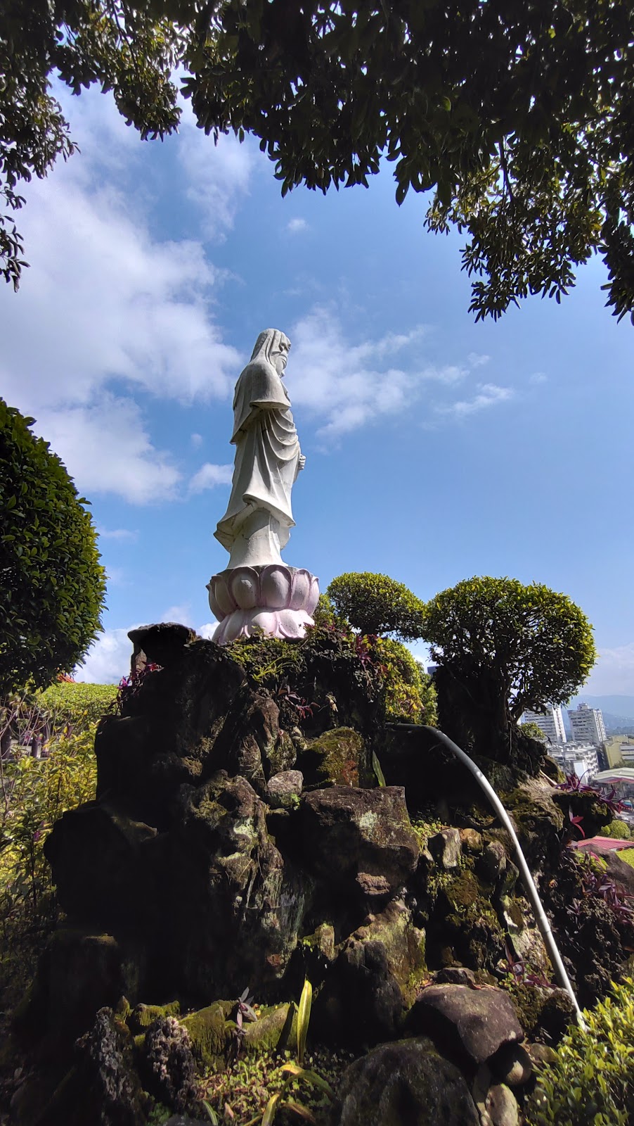 在上頭 休息, 欣賞過風景後, 才又沿著階梯 走回原來下面的那一層. 遠看下面那棵樹 修剪得真好, 好像一顆小平頭; 近看就更有意思了. 接著 往下 朝 關渡宮方向走, 先看到一尊 觀音像, 拍了下來後, 就往 關渡宮繼續前進.