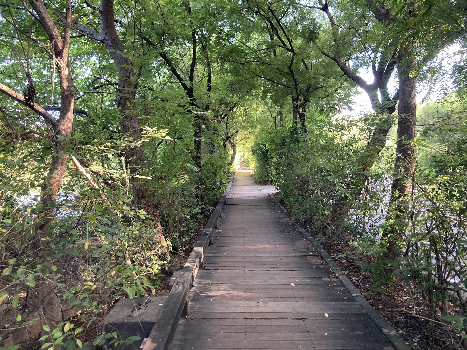 今天停了車,便沿"濕地公園"外圍的"綠色隧道"走。另外,看到很多人在定點運動,原來濕地公園有不同方向的入口可往內圈走。