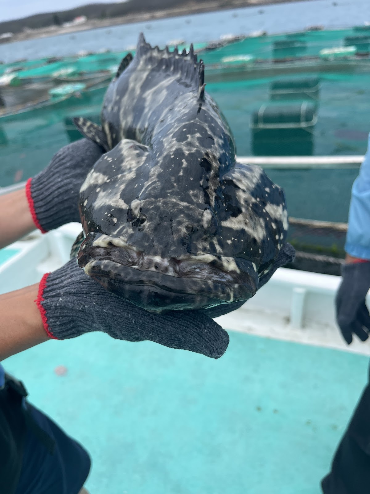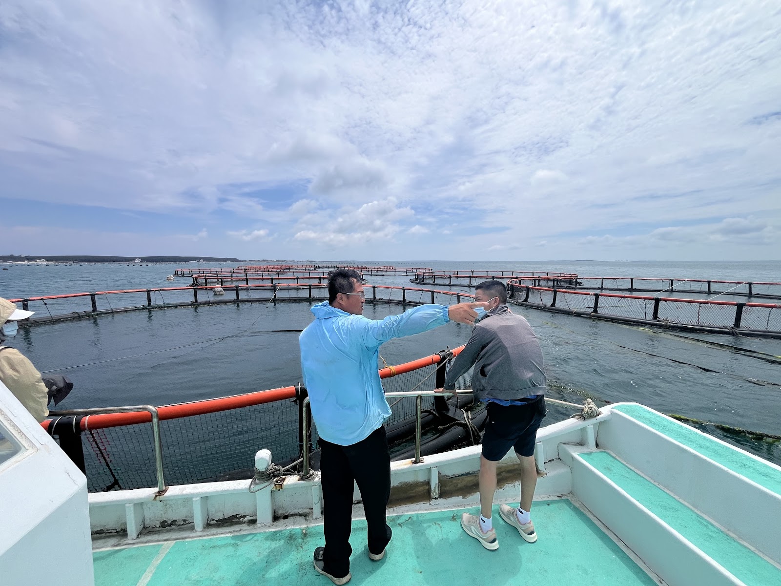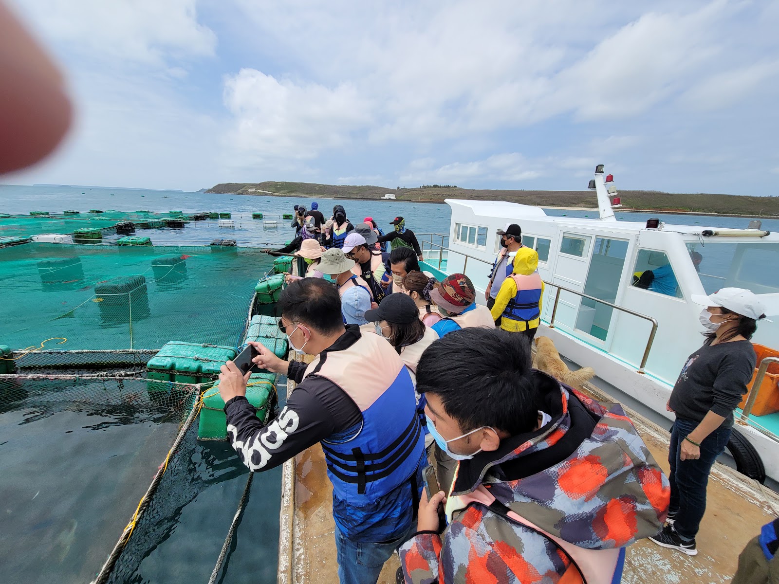 可以搭船到箱網旁邊餵魚 抱魚拍照