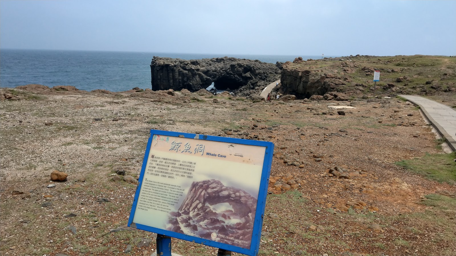 從小門地質探索館往上走,可以從遠到近欣賞鯨魚洞,不同遠近及角度都會有不同的感受。整體環境視野很好,玄武岩與濱海塊石的景緻很漂亮,步道完整,但不能離開步道進入鯨魚洞(步道旁有禁止進入警示牌)。