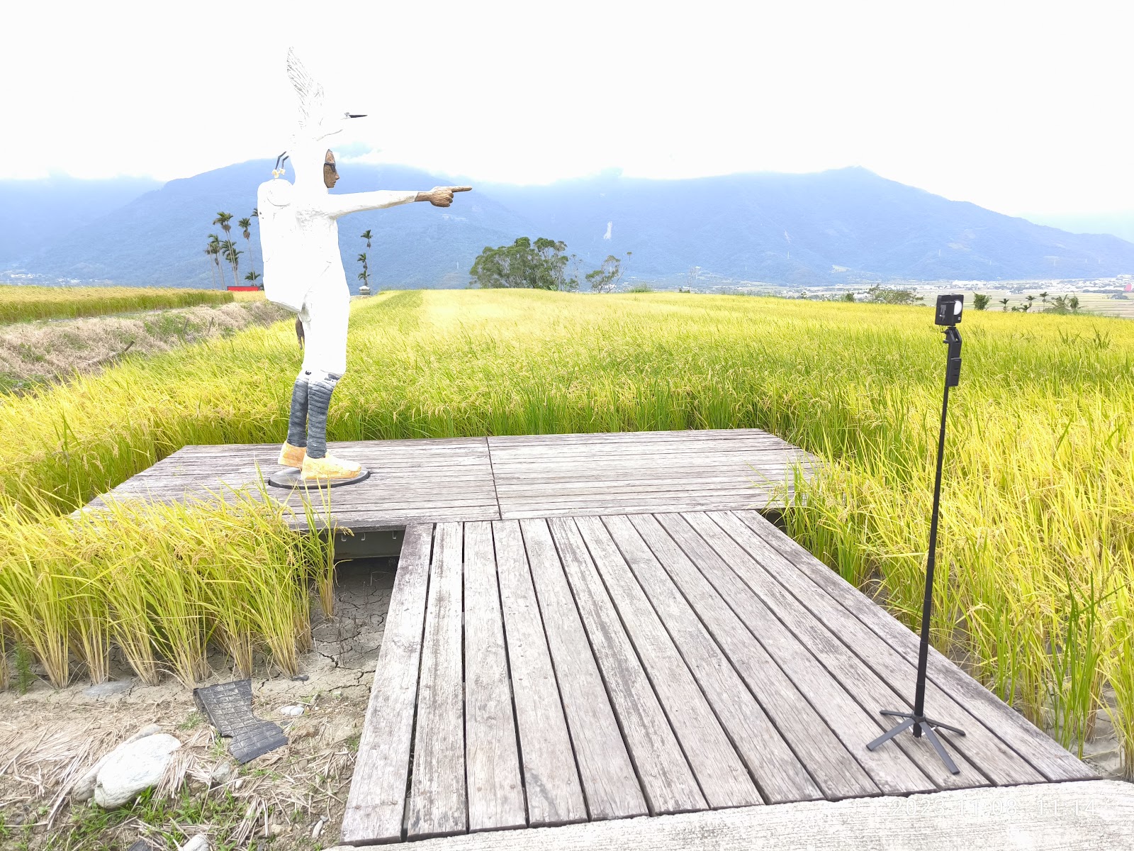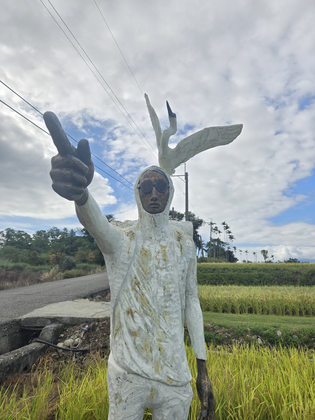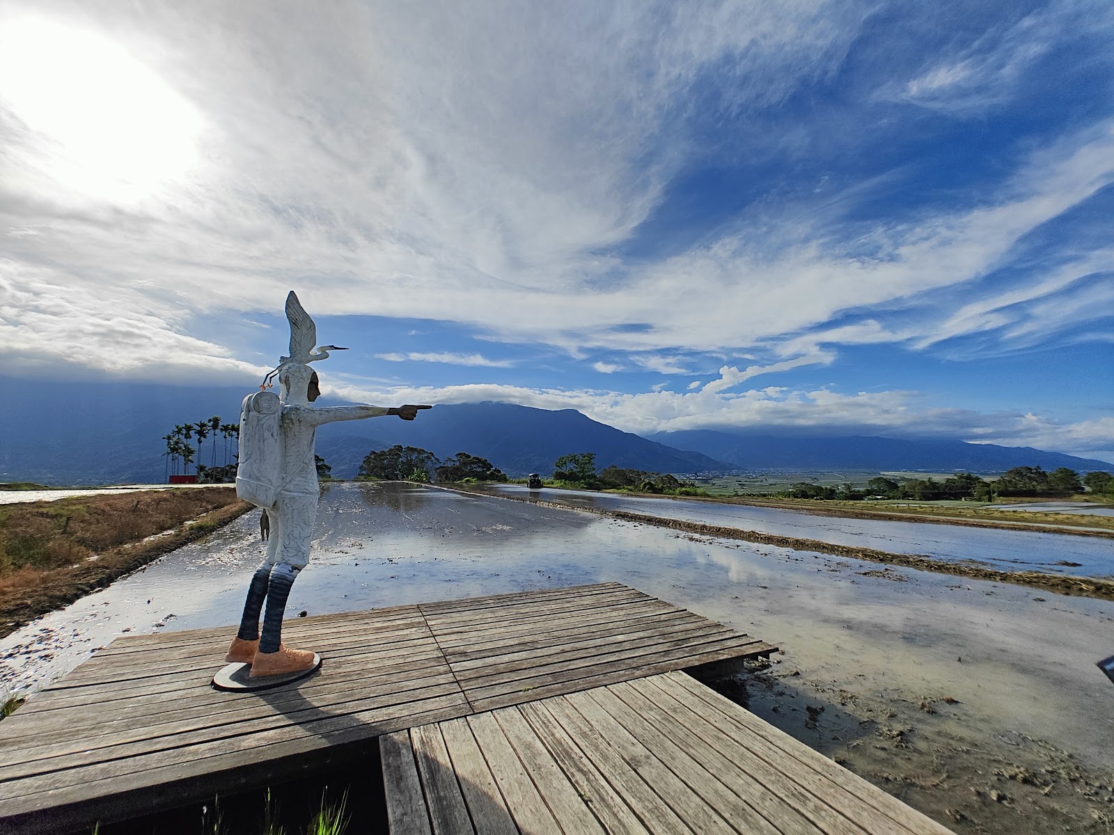 二月初剛要整地插秧前來到這裡,雖沒有綠油油的稻田,不過水田裡天空與山的倒影也是不錯。這個旅者很高,頭上頂著一隻鳥,手往前指著遠方,不知在想什麼?感覺很有內心戲,可以搭配各種合照。