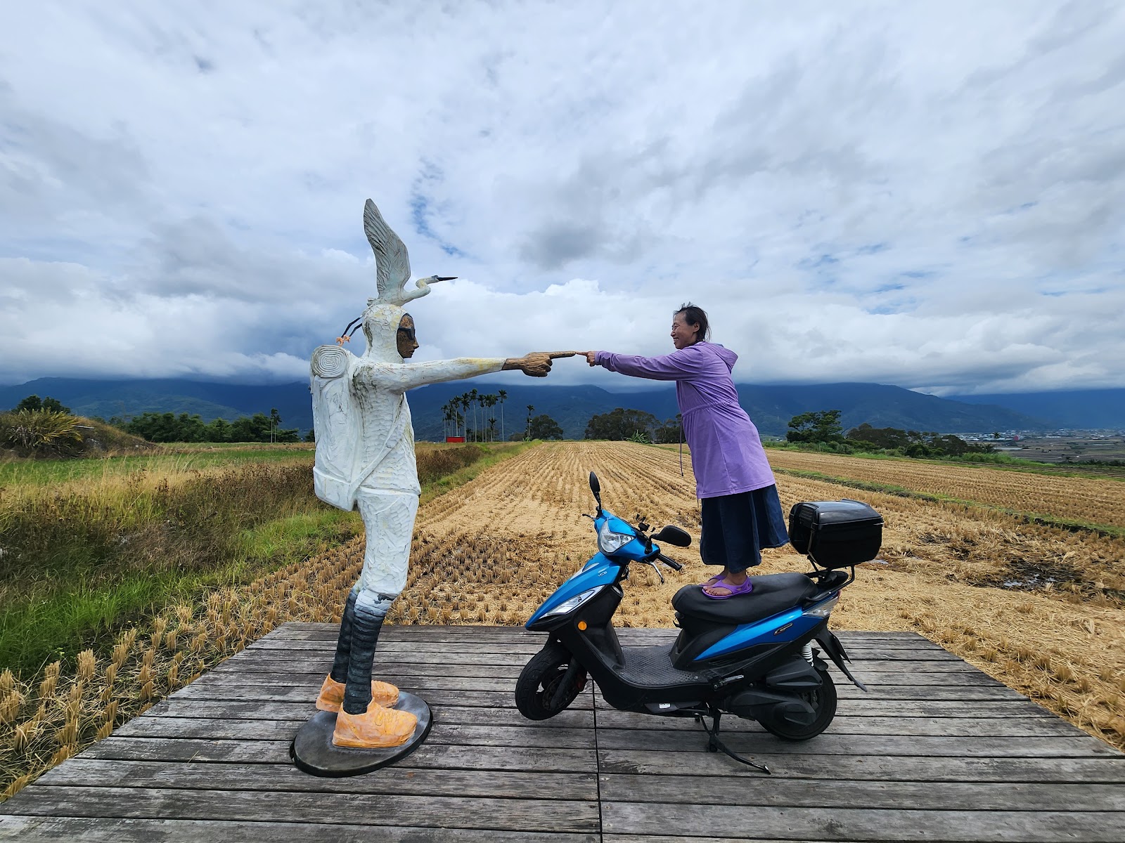 我從鹿野騎機車過來,看許多人在伯朗大道,而我的目標就是這裡;騎上山坡到梯田的位子,看到了一個人形站在那裡。