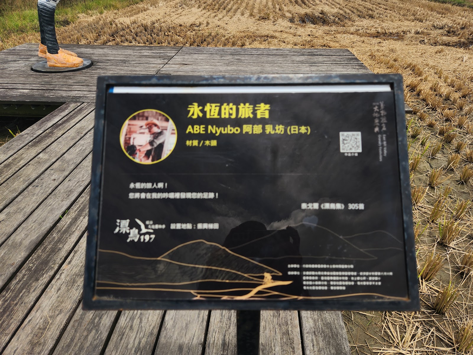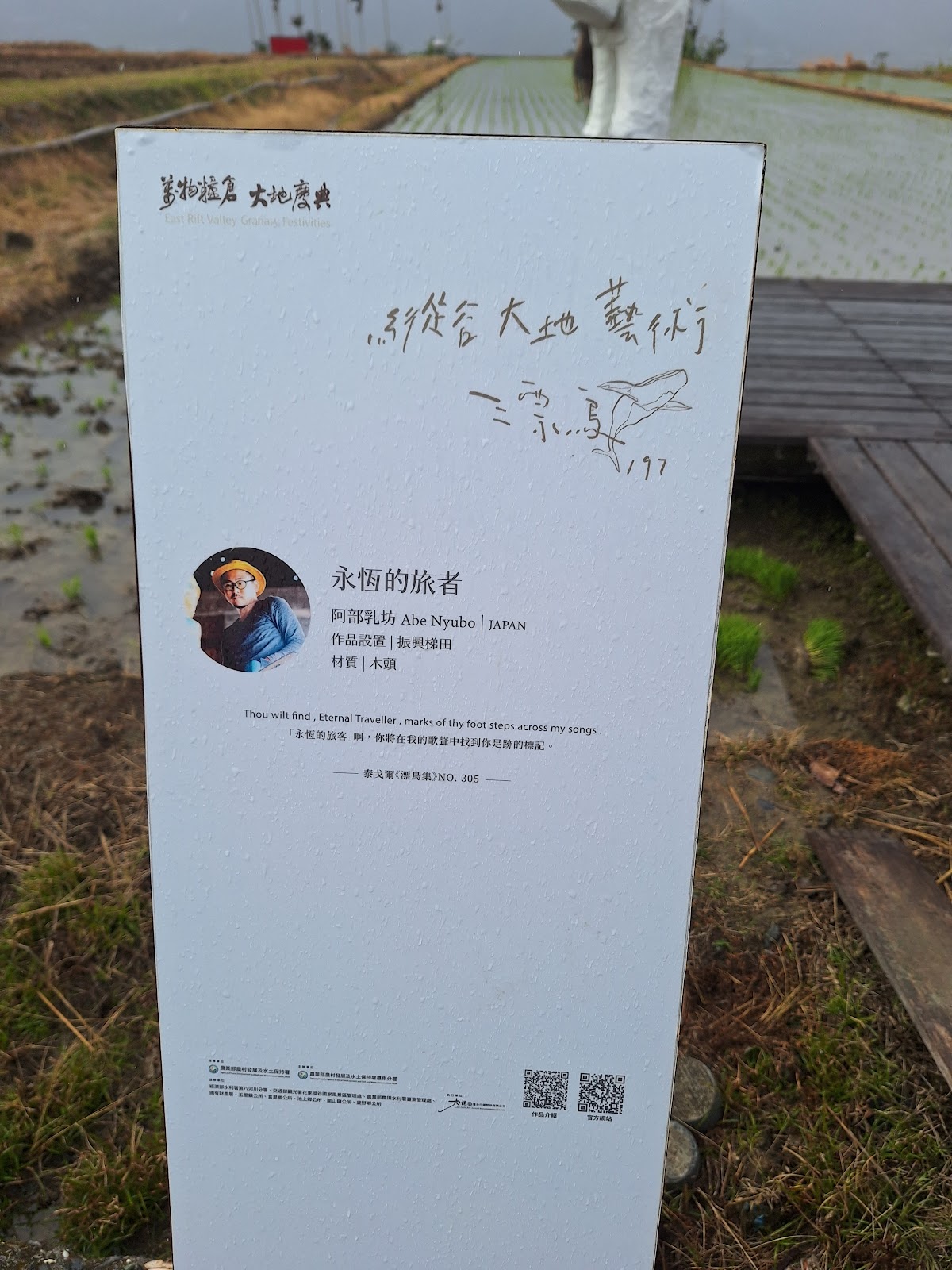 縱谷大地藝術季的作品最大的特點是擺放的位置都具有非常優美的田園風光或者雄偉壯觀的山水景色,其中的永恆的旅者擺放在臺東池上鄉的振興二號產業道路上的梯田邊,作者是來自日本的藝術家阿部乳坊。作品靈感源自於泰戈爾「漂鳥集」306首:「永恆的旅人啊!您將會在我的吟唱裡發現您的足跡!」。