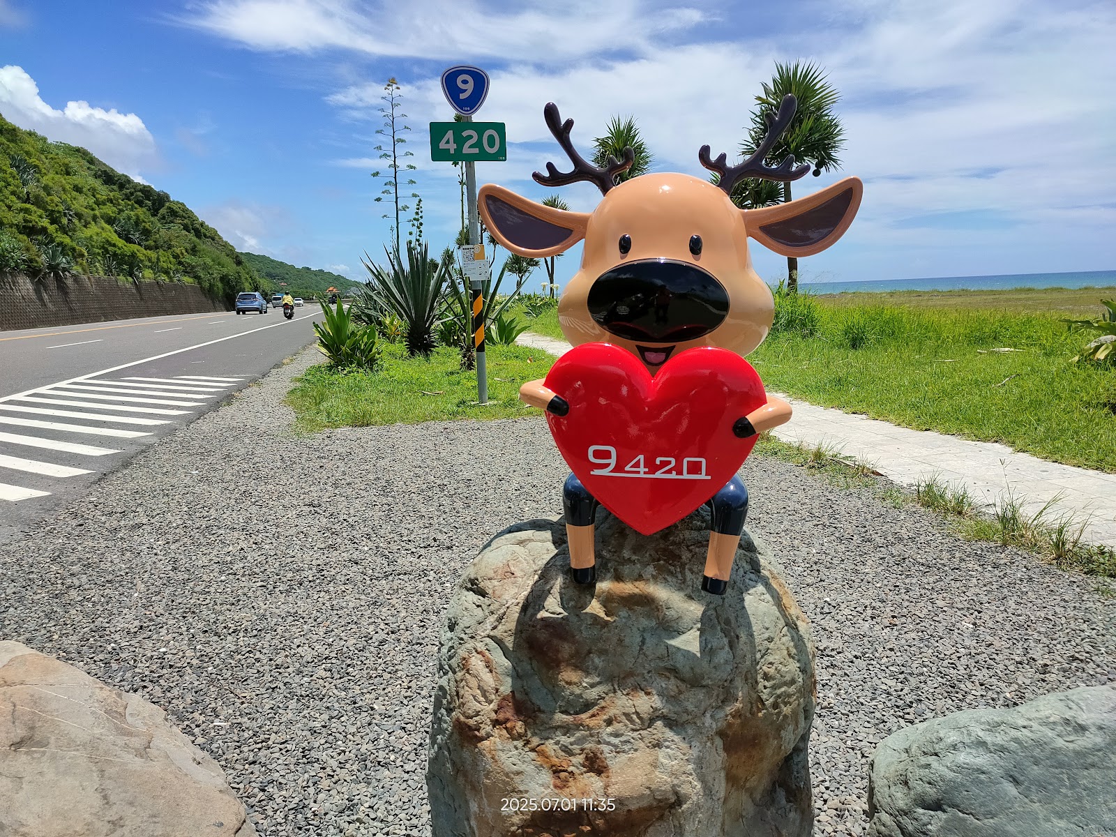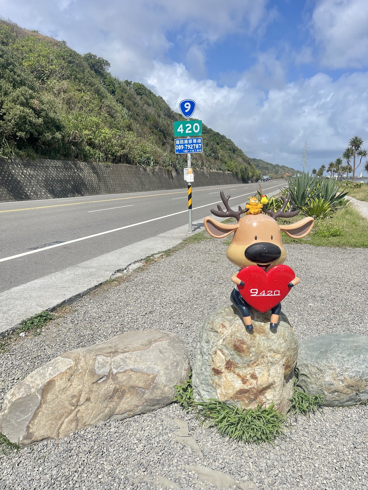 首頁 東台灣 台東縣景點推薦 幸福公鹿 No.4 鹿小愛 幸福公鹿 No.4 鹿小愛 看更多照片 共10張 景點位置 附近住宿 週邊活動 評價 景點位置 電話:08-979-2677 附近住宿 亞灣溫泉飯店 欣京棧民宿 亞灣溫泉飯店 門廷若室旅店-鐵花秀泰館 京棧興盛民宿 更多台東縣住宿推薦 週邊活動 2024台東景點|衝浪景點推薦 來台東「浪一下」!新手也能輕鬆上手 詳細介紹 2023台東美食|東海岸漁獲量最豐富!盤點台東成功漁港高人氣店家,將在地飲食風貌吃進肚 詳細介紹 台東元宵節|台東炸寒單活動介紹!必做、必訪、必玩的國際民俗文化活動 詳細介紹 評價 4.8 金龍 5/5 2025/11/23 腹地很大風景很漂亮,沿途很多裝置藝術 蝦咪魚 5/5 2025/11/16 拍照每次都倒數10秒✌️✌️,拍好拍滿,慢慢拍,開心。 陳禹叡 1/5 2025/11/13 一次快門10秒 佩服您們的耐心,能上百次 值得讚許,全家福哦 一家低X兒 lywen 5/5 2025/08/20 📍 9420幸福公鹿.鹿小愛|台東東海岸 經南迴公路進入台東的第一個必停景點! ✅ 幸福公鹿與小鹿裝置藝術超萌 ✅ 背景就是台東藍+無敵海景 ✅ 還能欣賞漂流木藝術 ⚠️ 提醒:颱風或雨季時,道路易積泥沙,行車需小心。 天氣好時,這裡就是最夢幻的網紅打卡點! #台東必去 #9420幸福公鹿 #台東藍 #東海岸 黃榮 5/5 2025/07/25 由屏東經南迴公路,到達東海岸的第一個停留:看9420、看海、看漂流木藝術。 颱風過後或雨季時,此路段易被山上流下的泥沙淹沒,騎車開車都要小心。 令孤沖 5/5 2025/07/06 很漂亮的地方,路過可以停下來看看裝置藝術品及湛藍的海景! ICE Fan 5/5 2024/06/30 一路玩著下當然要來踩點,9420幸福公鹿😁 JERRY 5/5 2024/06/17 唯一隻在海邊的小鹿🦌,應該也是全台人氣最高,打卡熱門度最夯的小鹿~「9420就是愛你」,真的太厲害了👍👍 李阿宏 5/5 2024/06/14 一大早5點多就很好拍了! 朵麗幸福小姐姐 5/5 2024/05/12 9420啦~~ 漂亮的打卡點 ❤️ 「就是愛你」打卡景點 台9線420K「就是愛你」 站在台9線大武海濱公園 望向台9線北方, 公路倚靠著陡峭山壁眺望大海, 享受碧綠原生植物與大自然藍天美景, 也見證著山盟與海誓, 與本路線里程樁號相互呼應! 自由騎士孤獨旅人(自由旅人) 4/5 2024/03/05 台9線420公里處語意就是愛你(9420) 在路邊停車拍照時盡量靠裡面一點不要影響其它用路人喔! 資料來源由Google提供