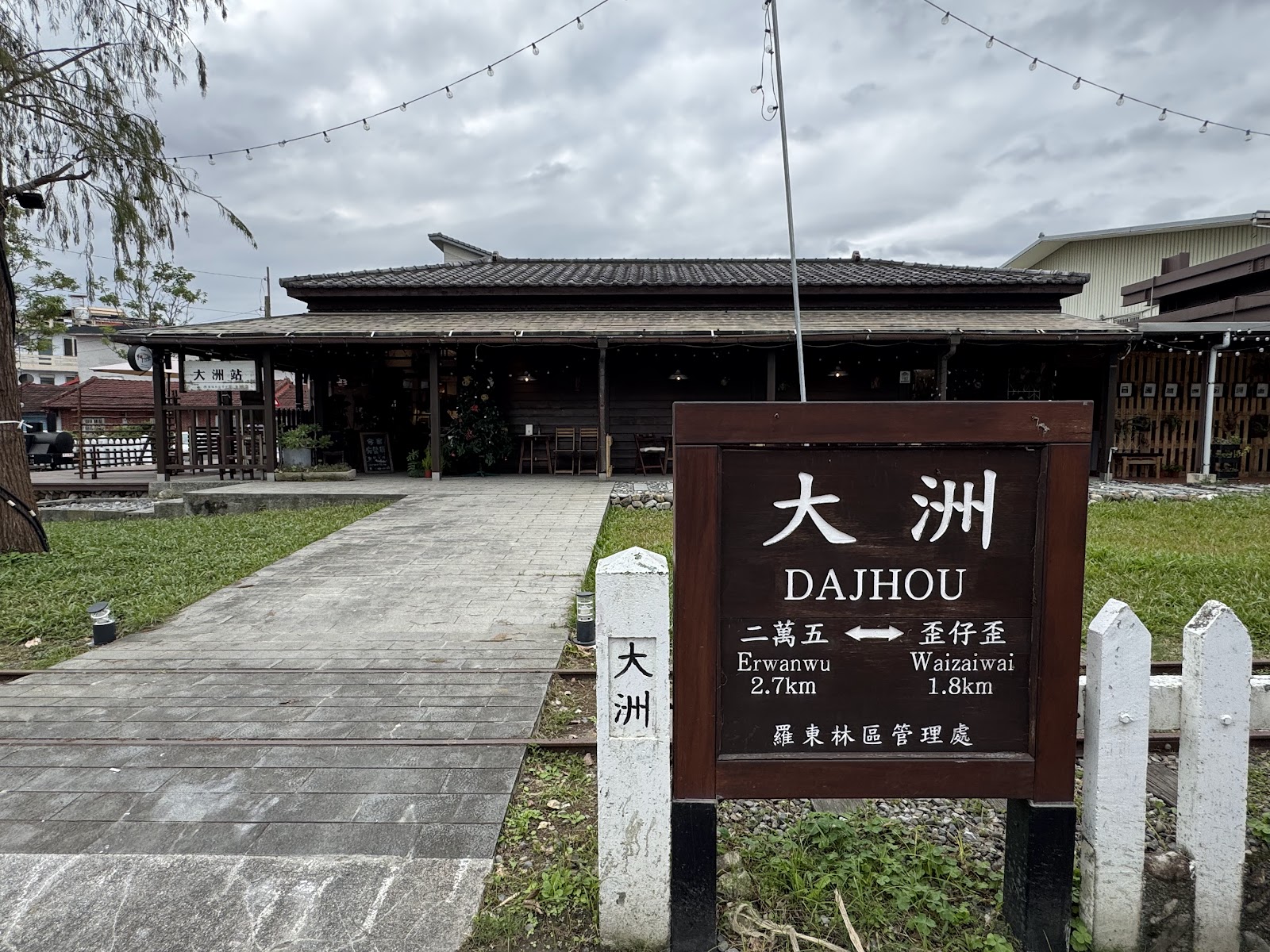 從( 羅運動公園)走(溪南自行車道)過(歪仔歪橋)左轉下(安農溪自行車道)( 大洲橋)左轉(五分路二段)到(大洲車站),車站雖小改裝成蠻有特色的咖咖館,很放鬆
