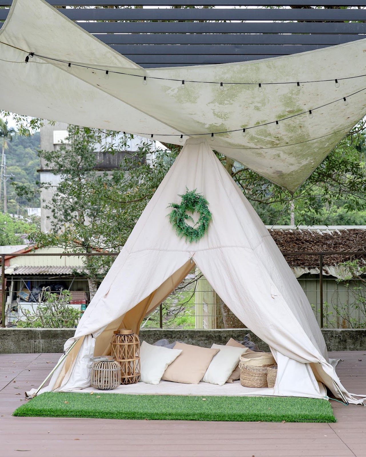 正中間是一個寬大的空間,好天氣,小朋友可以在這放電,客人也可以在此搭棚子享受戶外野餐的氛圍,pizza有帳棚可以租借,