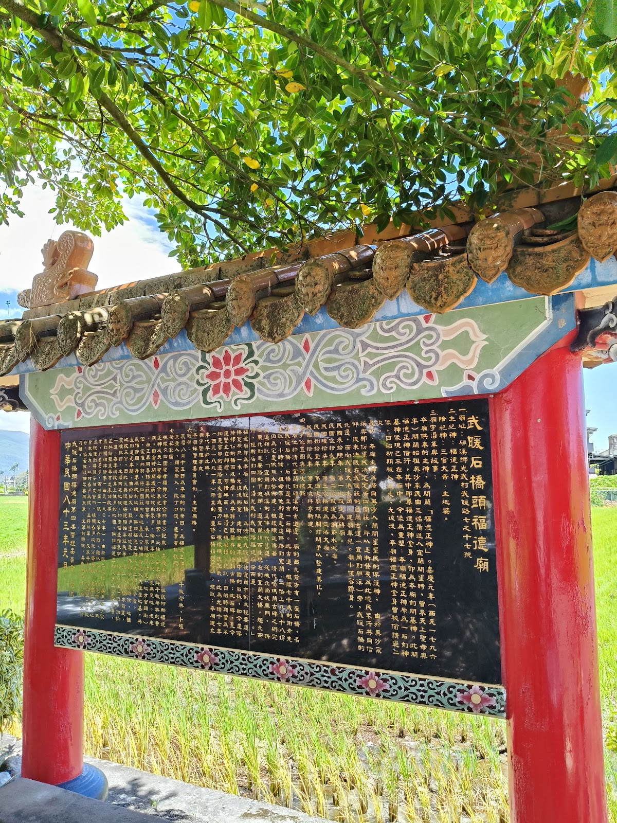這間武暖石橋頭福德廟,是我這次行程中的第五站,旁邊停車場的很大,不用擔心沒停車位,廟對面有一片像小花園的地方,滿漂亮的,也有小河,旁邊也有稻田,而且這間土地公廟能看的到火車,雖然我不是鐵道迷,但應該滿適合鐵道迷來這蹲點拍火車,而且我發現能蹲的點應該有的好幾個,廟裡有提供飲水機,也有廁所,旁邊也有人在整理廟的周圍環境,來到這間土地公廟,感覺也是很不錯,真的是心曠神怡,整體感覺起來非常的舒服,想來走走的人,能參考看看。