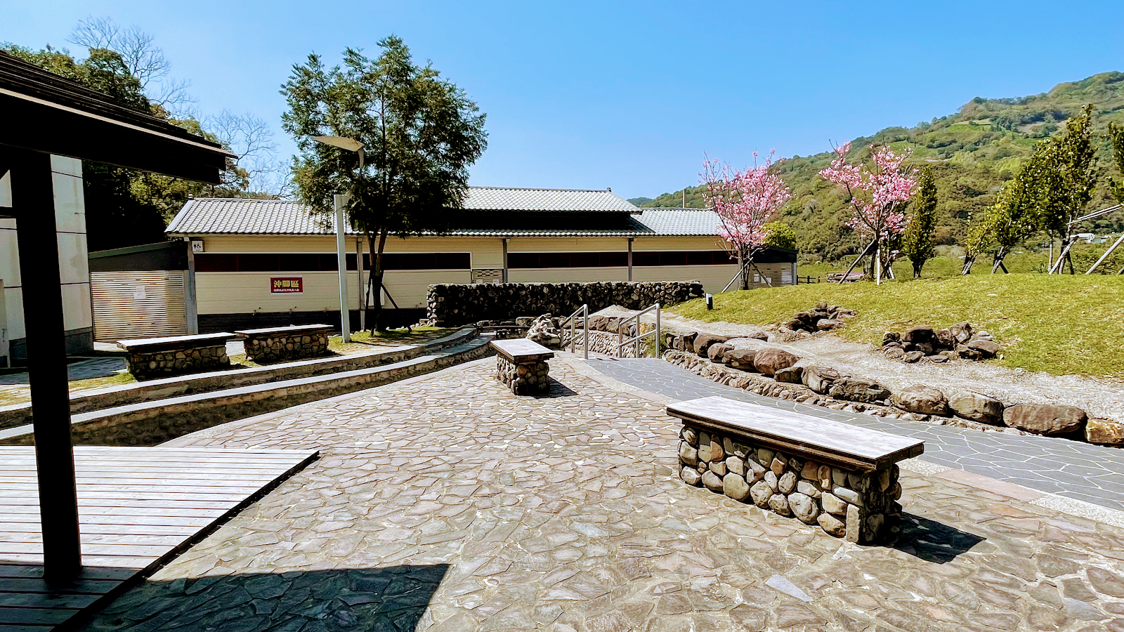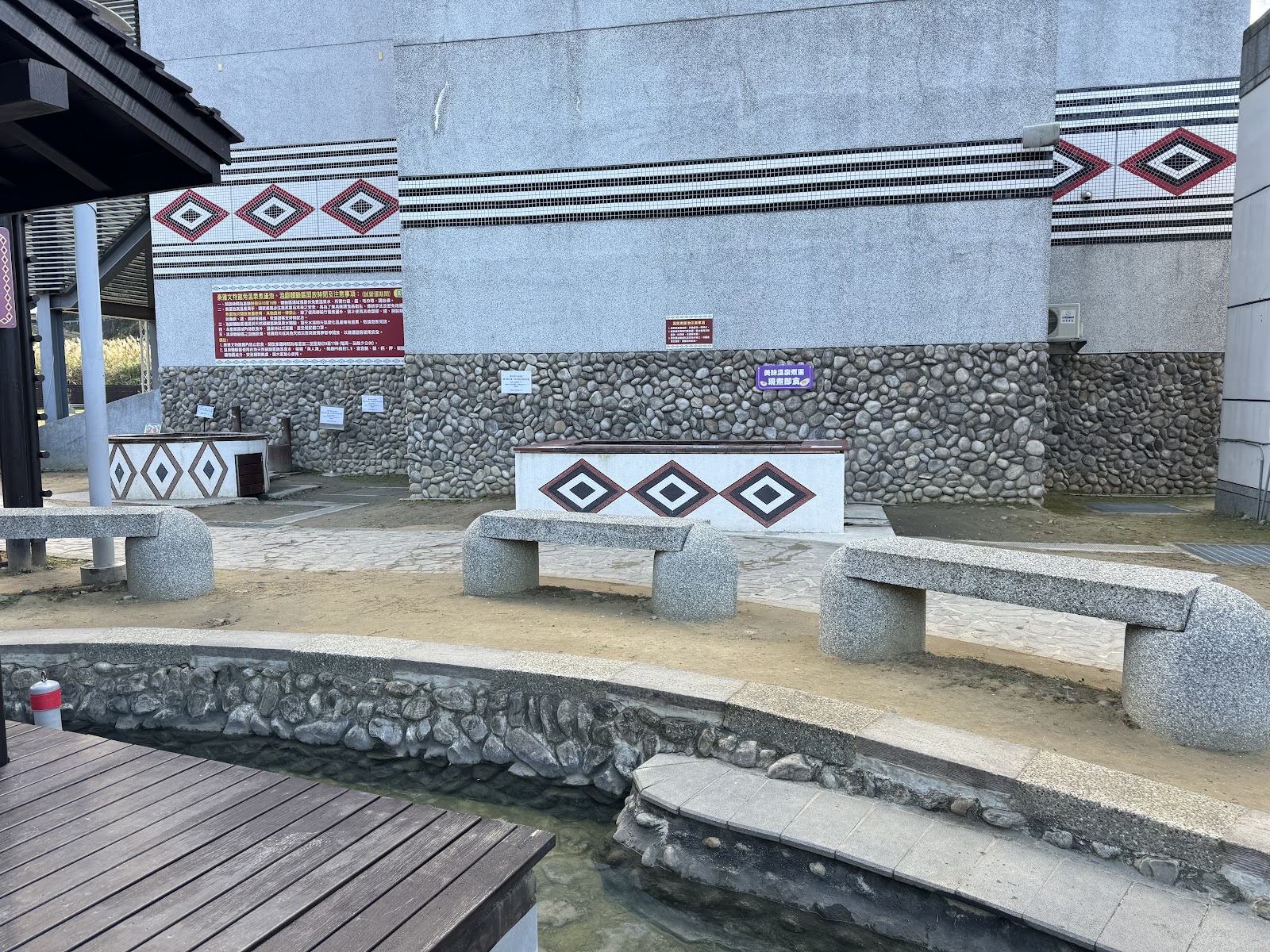 園區空間大,泡腳池水溫不高,小孩泡也很安全,只是動線或指示沒有,等泡了腳後才看到有沖洗處寫..泡腳前先沖洗.....