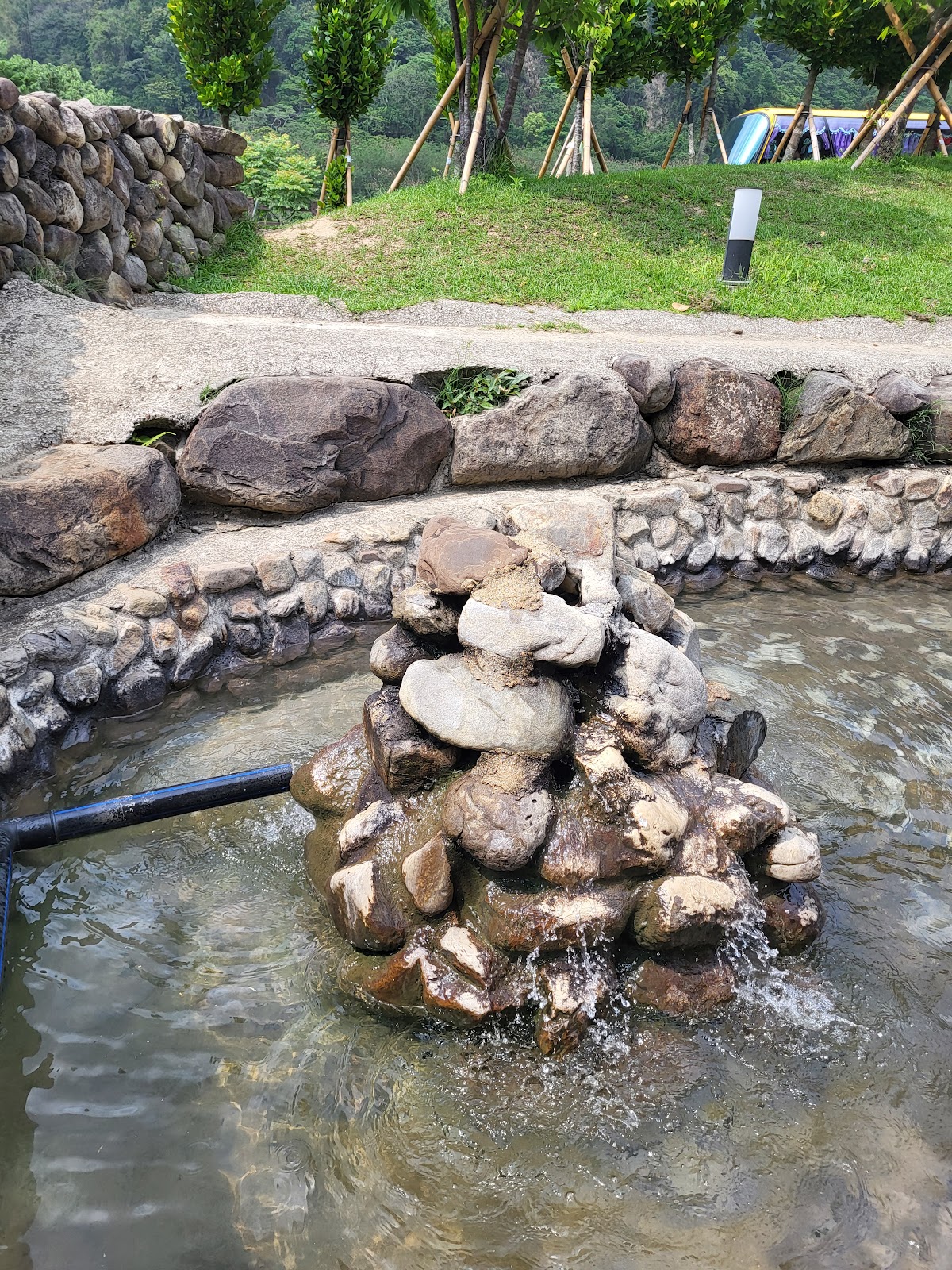 有免費泡腳池,注意要先去旁邊把腳洗乾淨才能泡~水溫不高溫溫的,水煮蛋要租竹簍50塊,有停車位但假日人太多會不夠要停到外面。