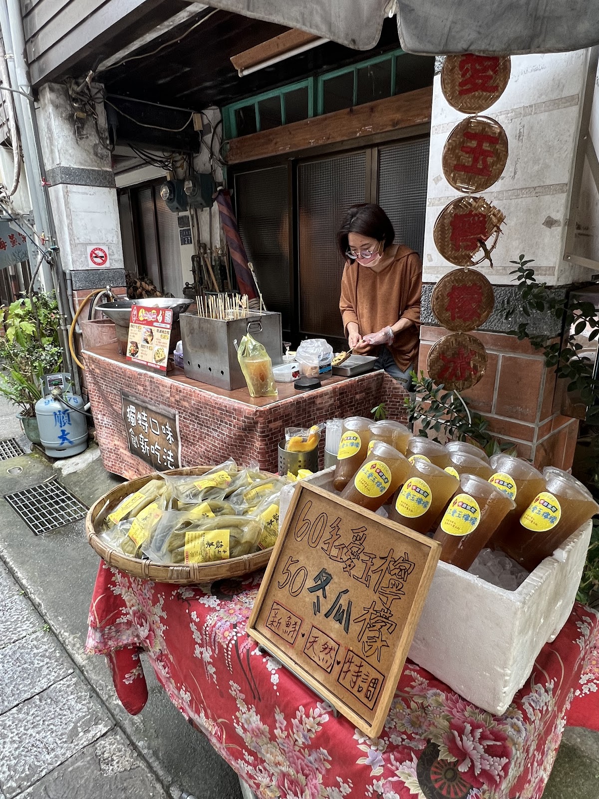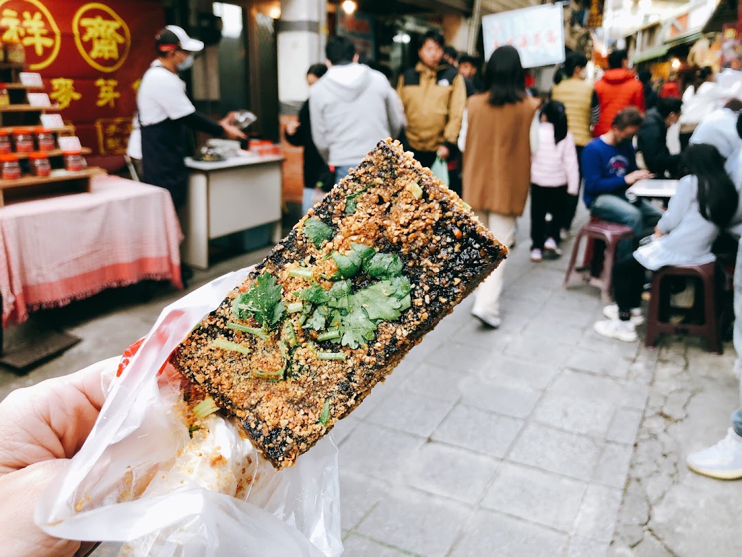 內餡是刈包、豬血糕的材料:香菜、花生粉、酸菜,加辣更香。滷豆乾滷的非常入味,逛了一條街吃完後我們覺得太好吃,回程再買一個😂