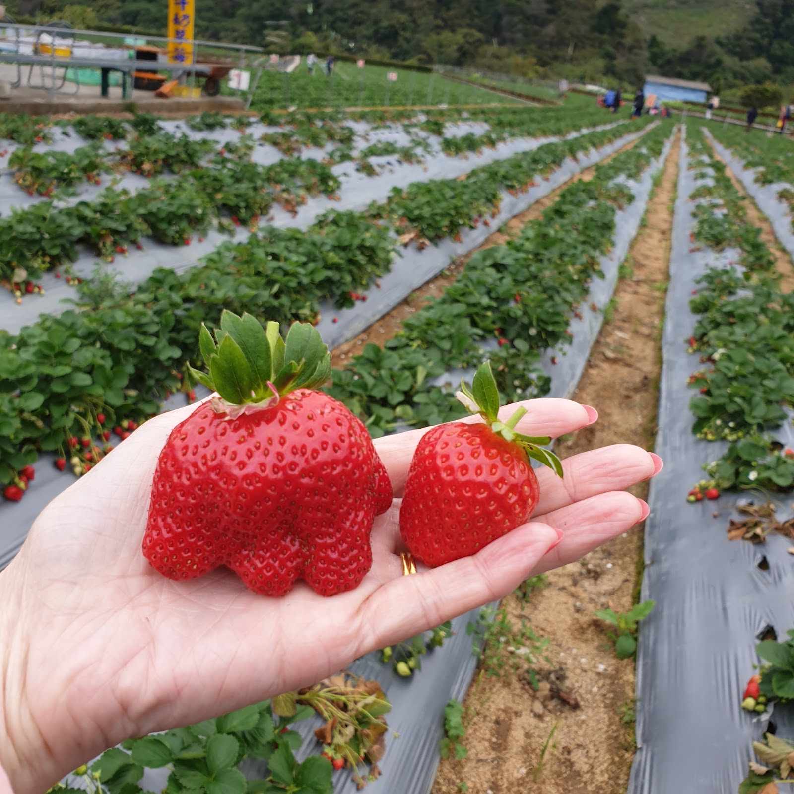 草莓園很大,草莓果很多,小朋友採得很開心,但入園時沒看到採果規則,以為有白草莓的品種,採很多顆因為很漂亮很大顆⋯結果是還沒成熟的🍓草莓,對老闆娘很不好意思😅