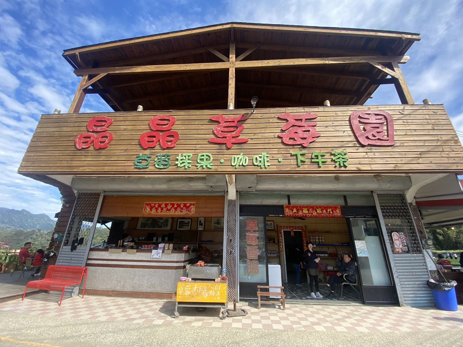草莓都很紅 很大顆,有高架也有平面的可以採 一斤$500,草莓品質很好👍🏼👍🏼另外有草莓香腸、草莓雪糕、草莓果乾等周邊小零食😍