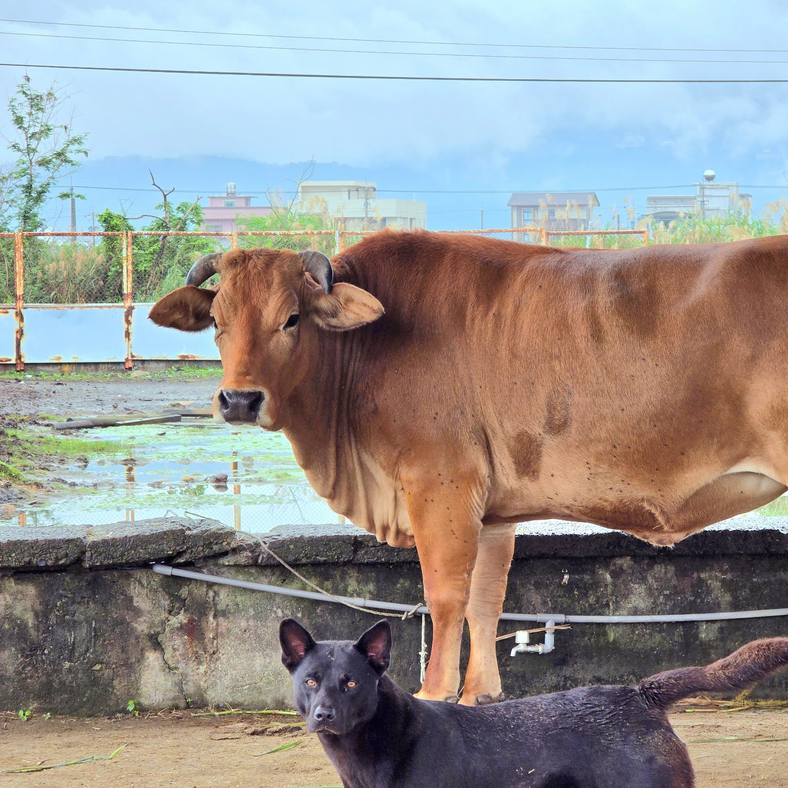 另外有一隻黑狗是園區飼養,也有一隻附近的黑狗會來逗牛,都蠻溫和的不會攻擊或低吠。