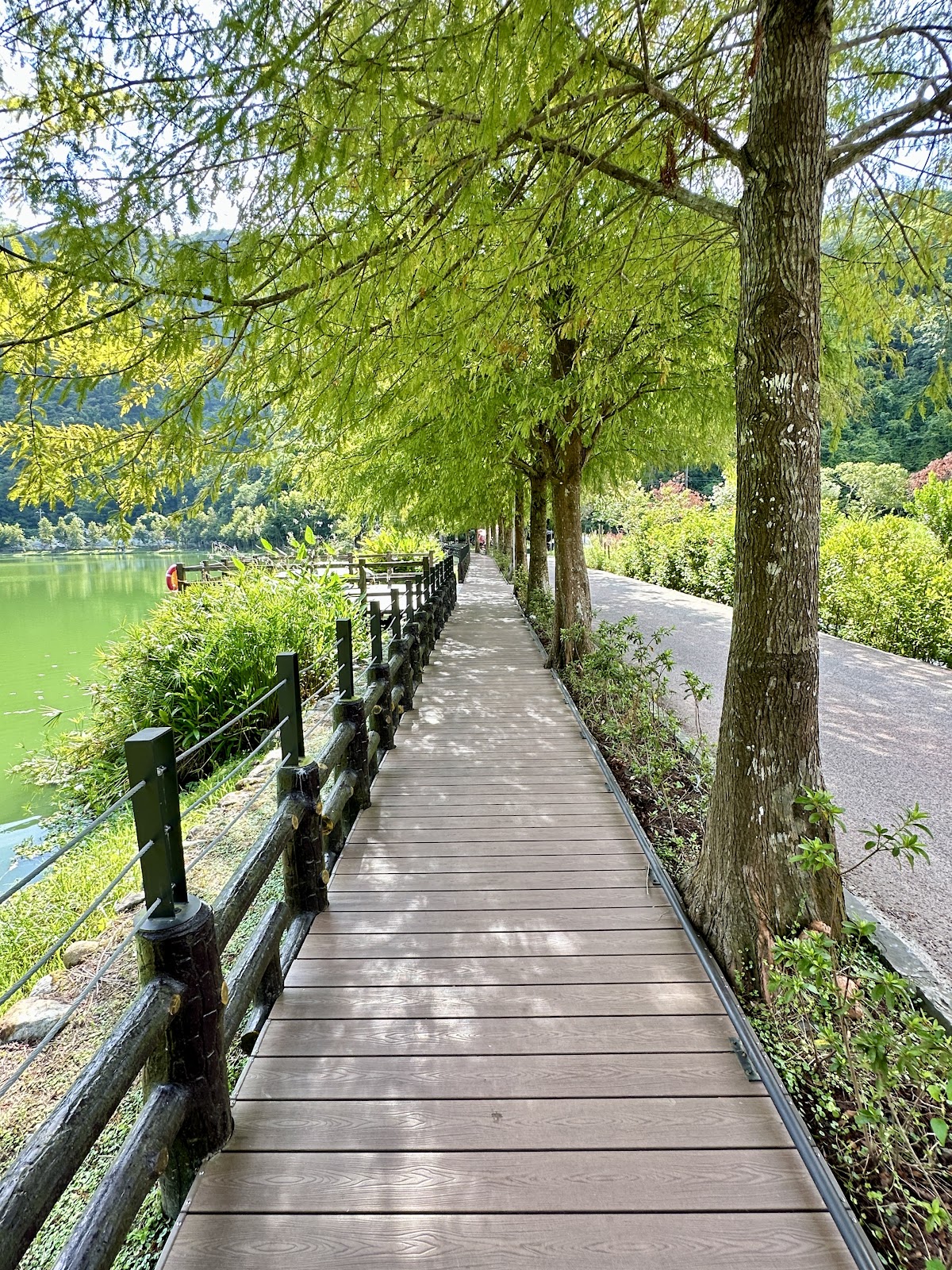 這條飛龍步道,目前好像僅剩至望龍埤上方觀景台這段路程可走,但這段路北端入口木棧道處,比較濕滑落葉也多,行走需多加留意小心。從北端入口至觀景台,再由南端入口出來,約30-40分鐘即可走完難度不高,沿途也都在樹蔭下,比走環湖步道多點運動效果,如果有時間的話,來走一走也可看到不同的望龍埤。