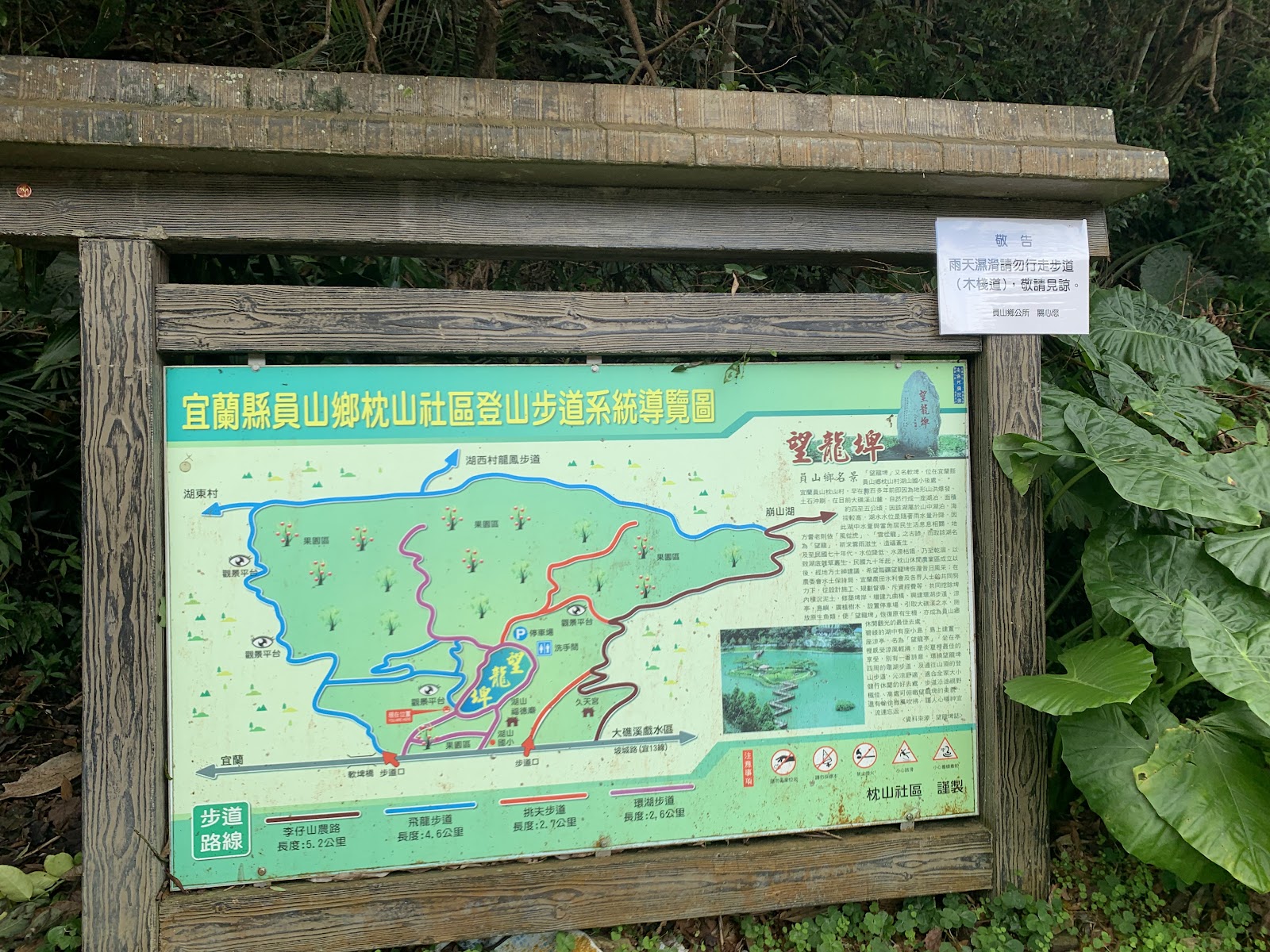 步道最大的特色是其制高點的絕佳展望。步道入口處大多從望龍埤的九曲橋或大頭鵝餐廳附近開始,雖然前半段是連續上坡的階梯,對體力有一定要求,但全程大多在林蔭之下,涼爽宜人。登頂後,不僅能從高處一覽望龍埤宛如飛龍般環抱湖泊的完整面貌,還能遠眺蘭陽平原與龜山島。步道呈環狀,全程約需1至1.5小時,非常適合搭配望龍埤環湖行程,作為一趟結合自然美景與適度運動的半日遊路線。小叮嚀:豪雨季節時曾有登山客遇困記錄,山區天候不穩需要事先查詢天氣並做好防滑準備。